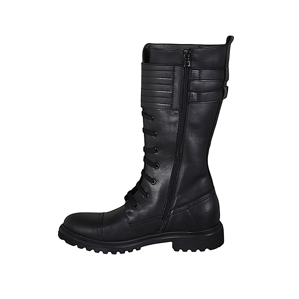 Bota para mujer con cordones, cremallera y hebillas en piel negra tacon 3 - Tallas disponibles:  44