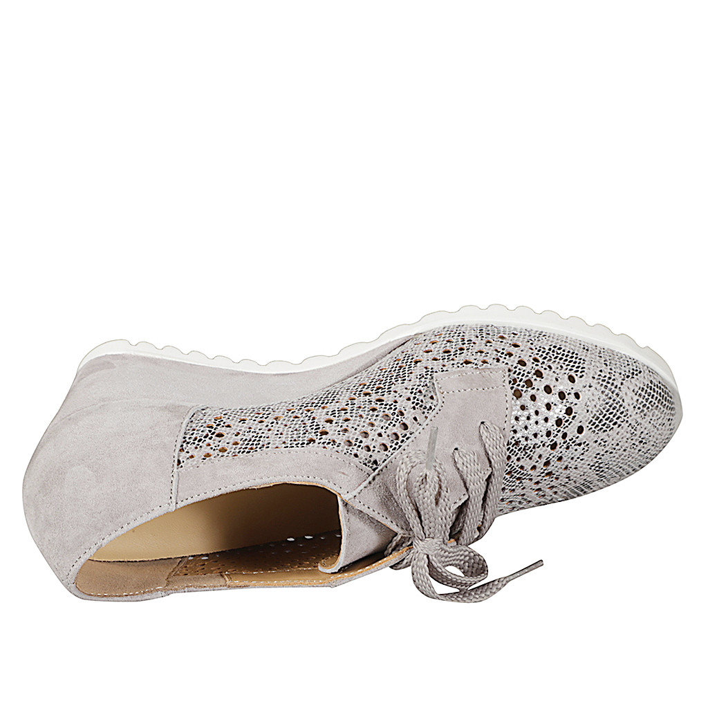 Zapato con cordones, plantilla extraíble para mujer en gamuza gris y piel perforada e imprimida con cuña 6