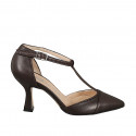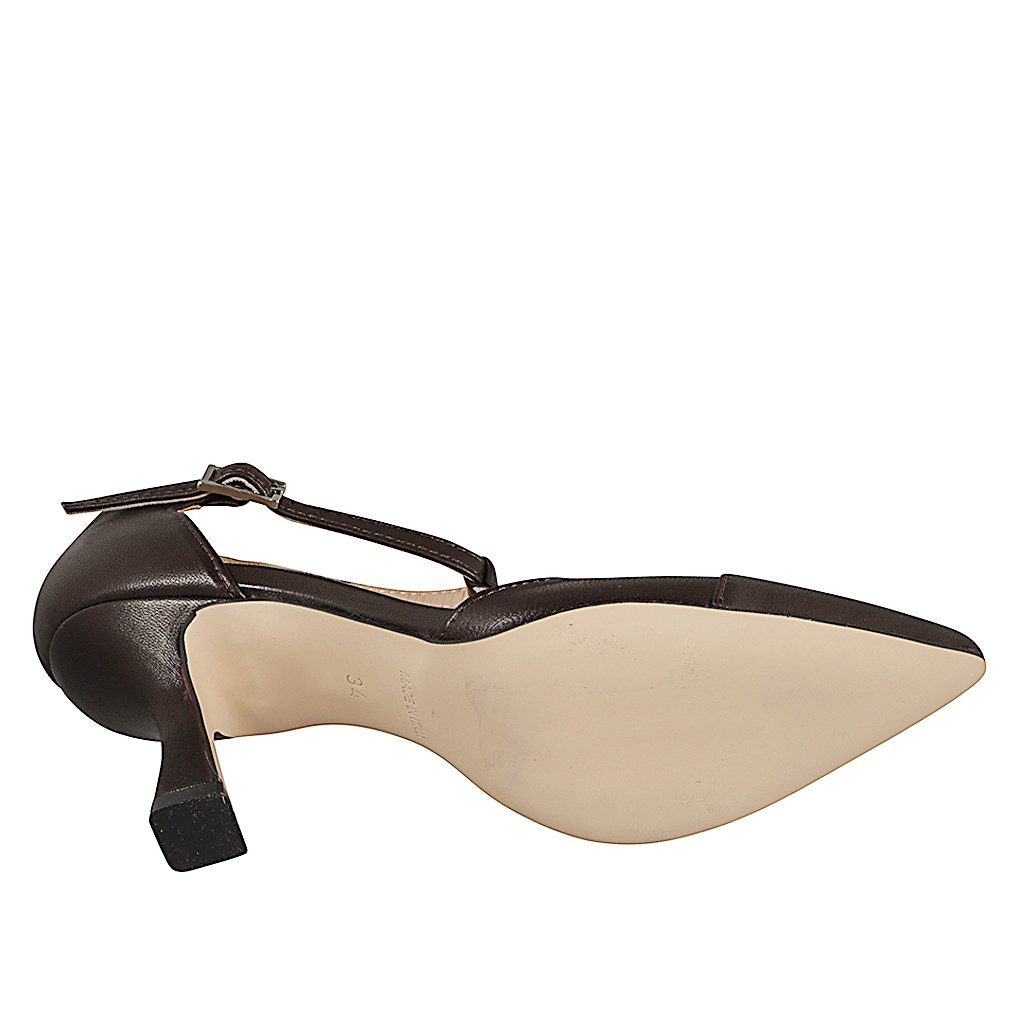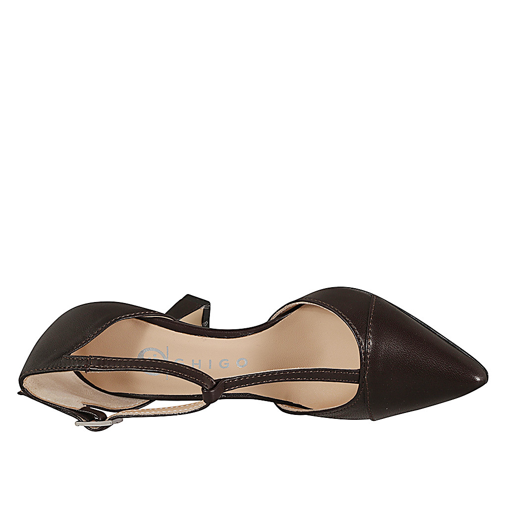 Zapato abierto a punta para mujer con puntera y cinturon charleston en piel marron oscuro tacon 7