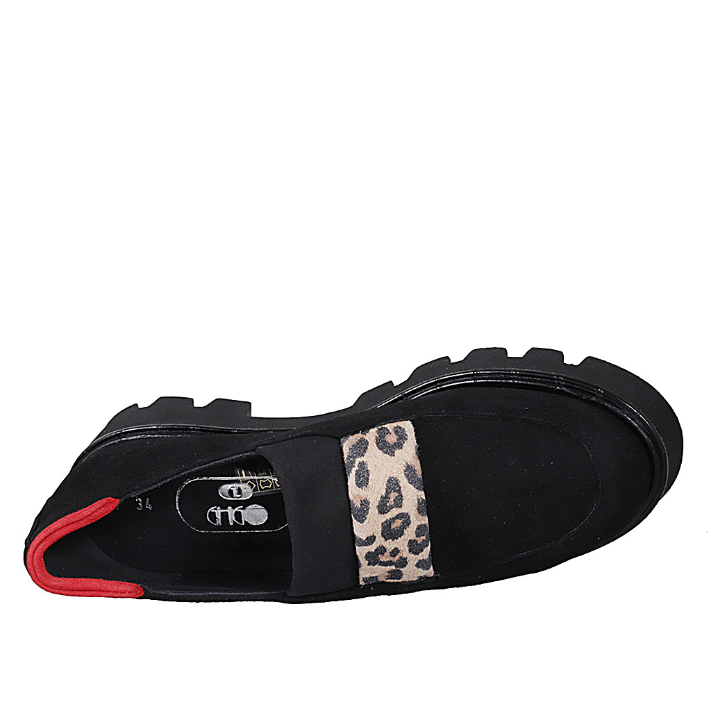 Zapato para mujer con accesorio en gamuza negra, moteada y roja y tejido elastico negro tacon 4 - Tallas disponibles:  33, 45