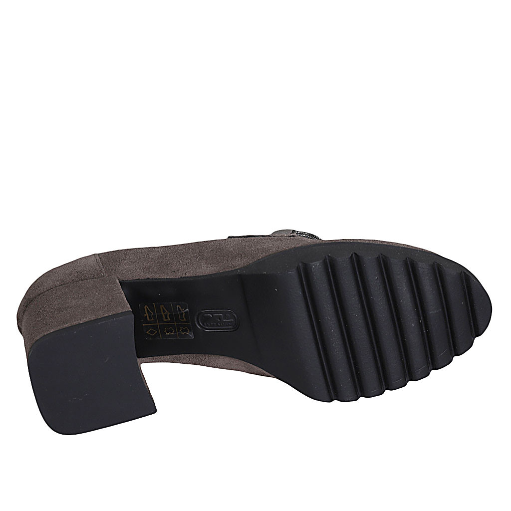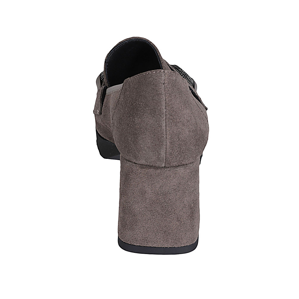 Mocasín para mujer con accesorio en gamuza gris pardo tacon 6