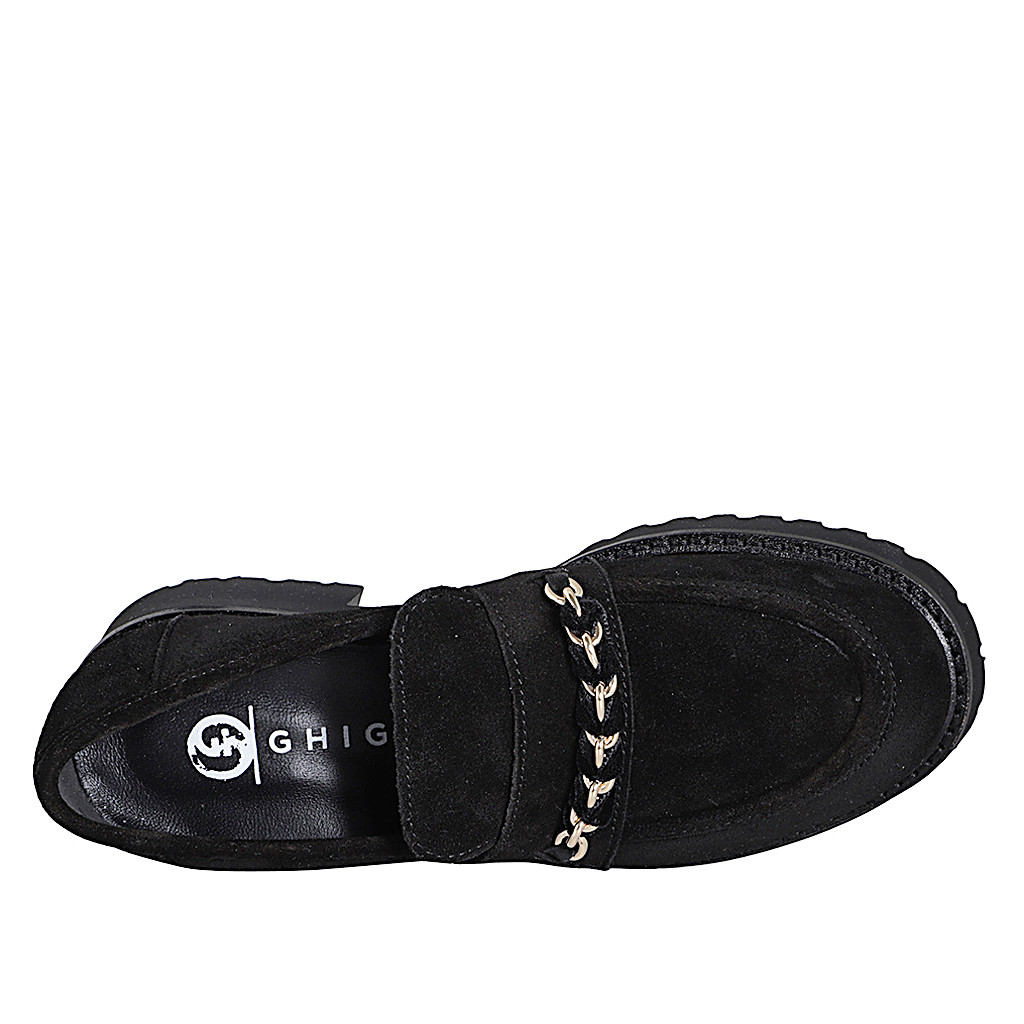 Mocasino deportivo para mujer con cadena de oro en gamuza negra tacon 5 - Tallas disponibles:  45, 46
