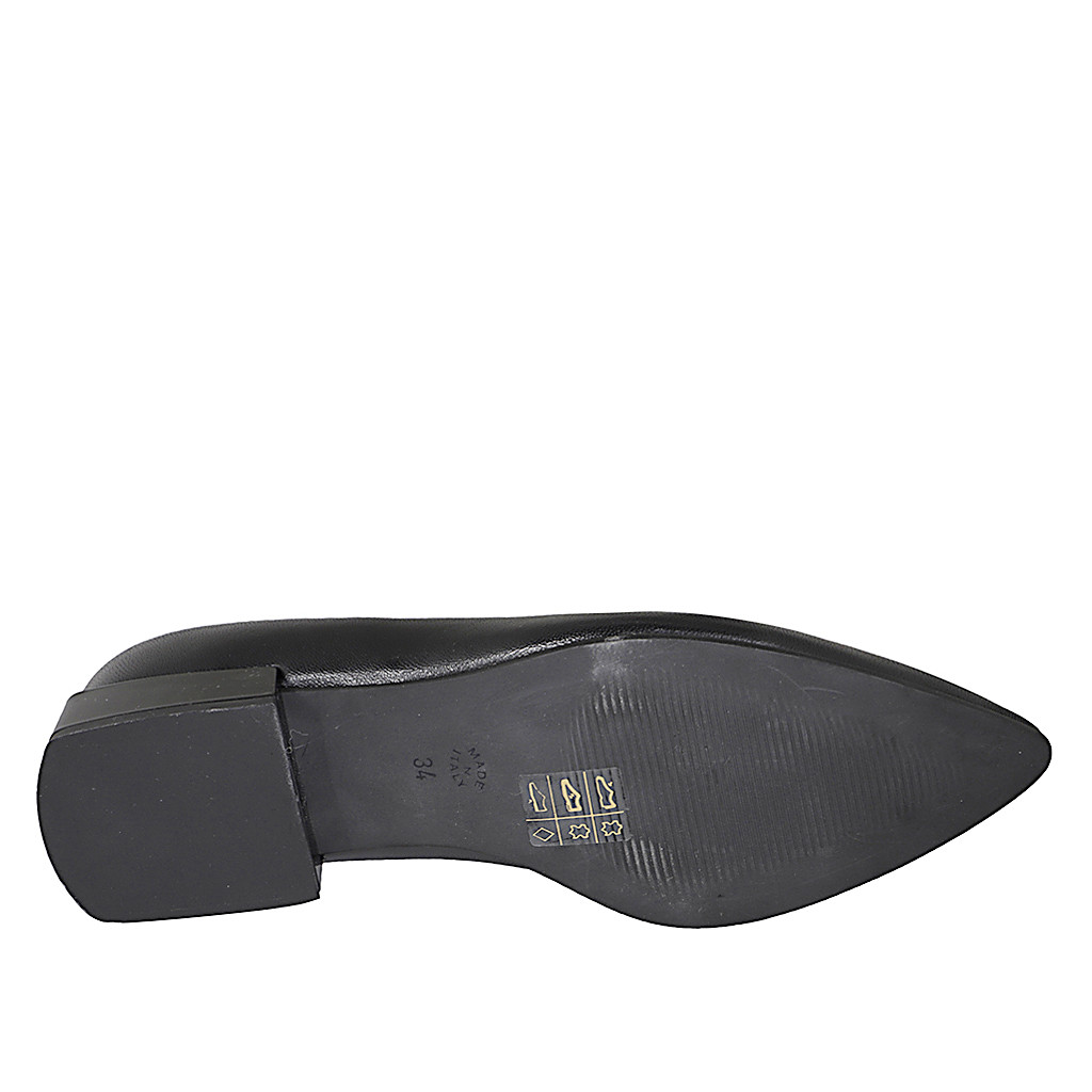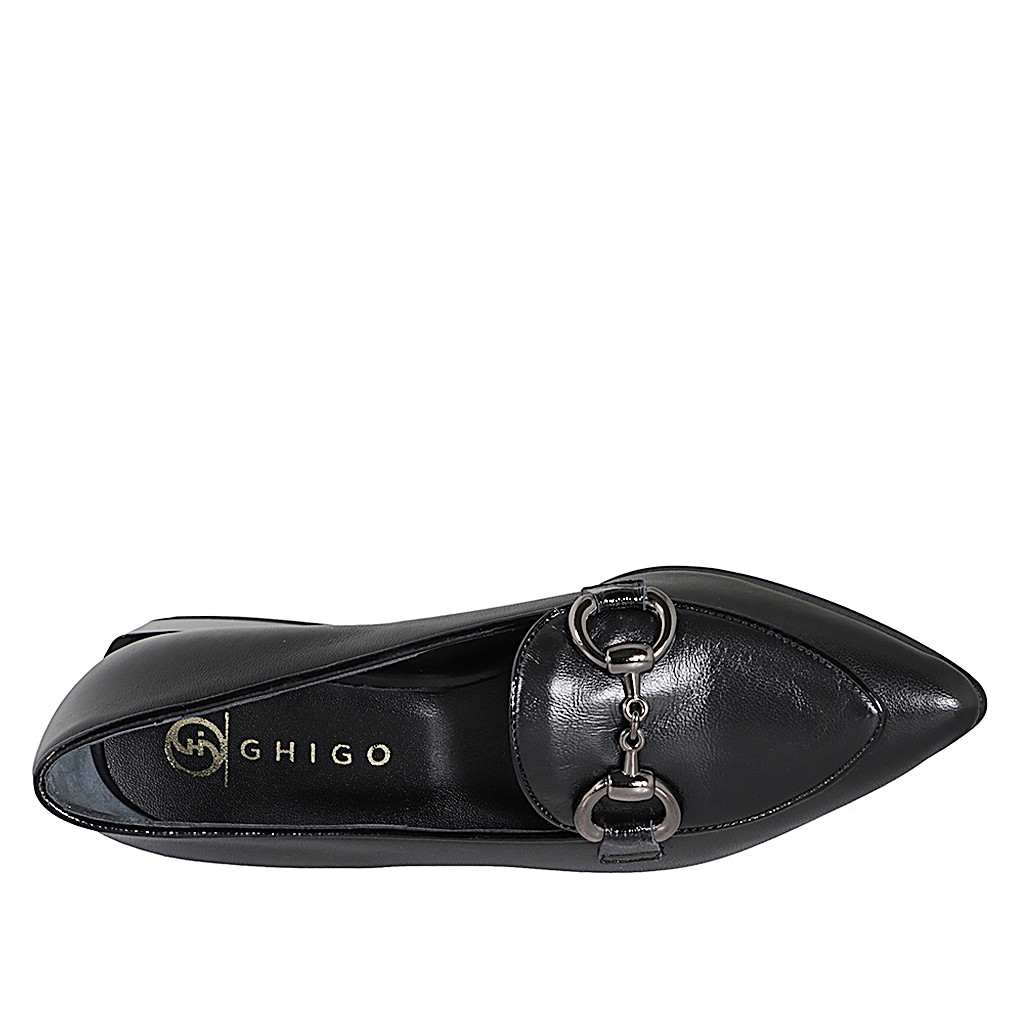 Mocasino a punta para mujer con accesorio en piel y charol negro tacon 3 - Tallas disponibles:  33, 34, 35, 43, 44, 45, 46