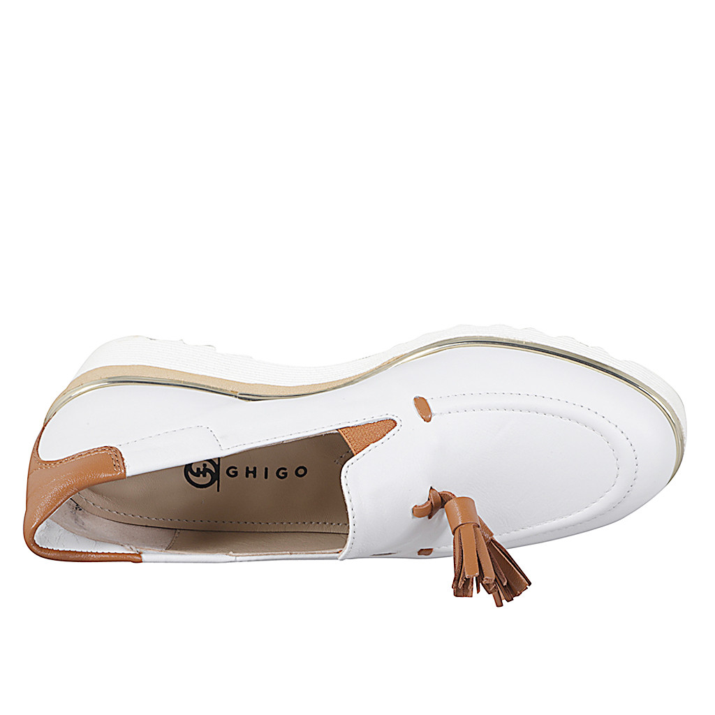 Mocasino con cuña para mujer con elasticos y borlas en piel de color blanco y cognac oscuro cuña 4