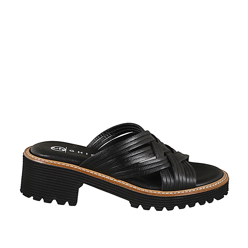 Sabot abierto para mujer con tiras trenzadas y suela dentada en piel de color negro y tacón 4