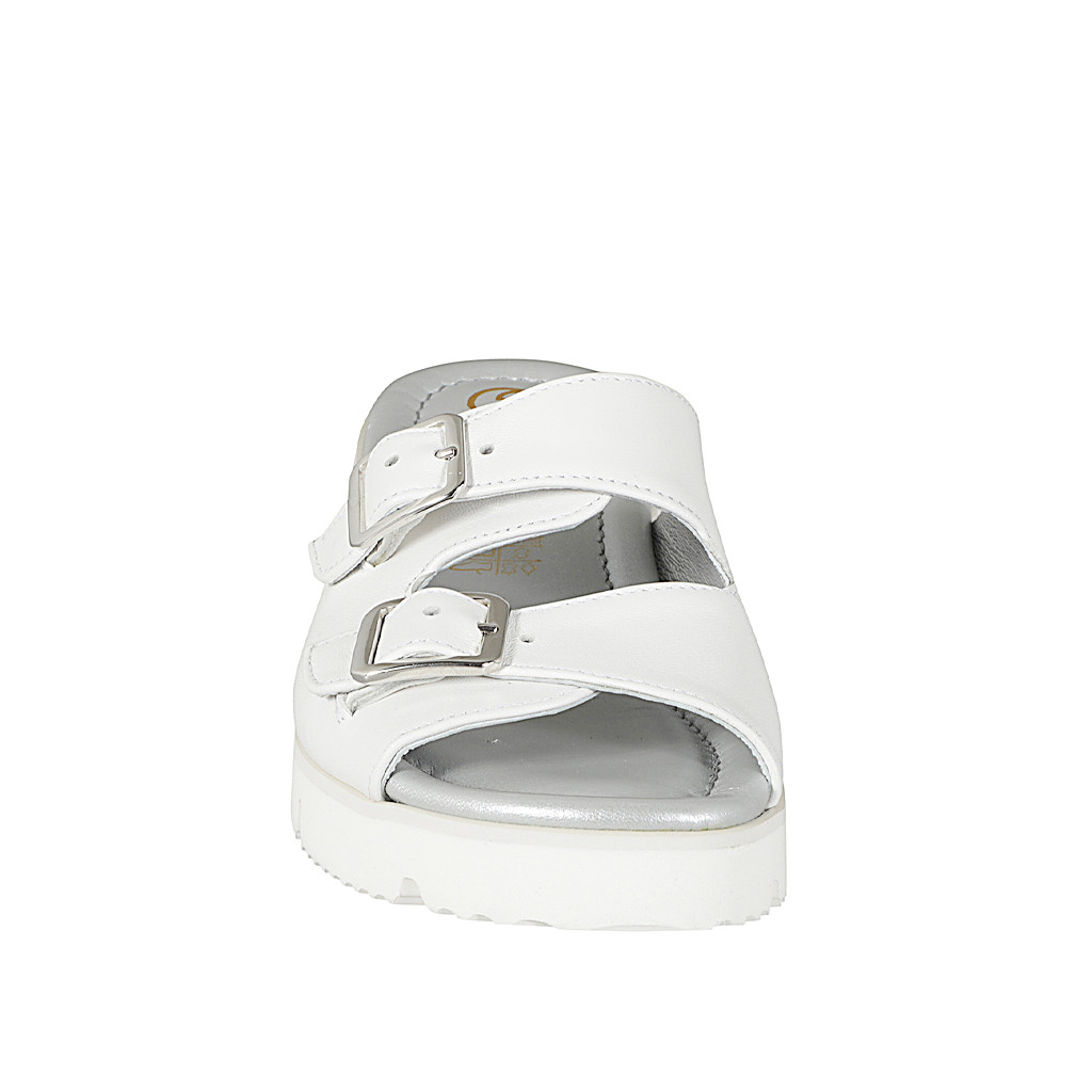 Sabot abierto para mujer con plantilla de memory foam y doble cierre de hebillas ajustables en piel de color blanco con cuña 3