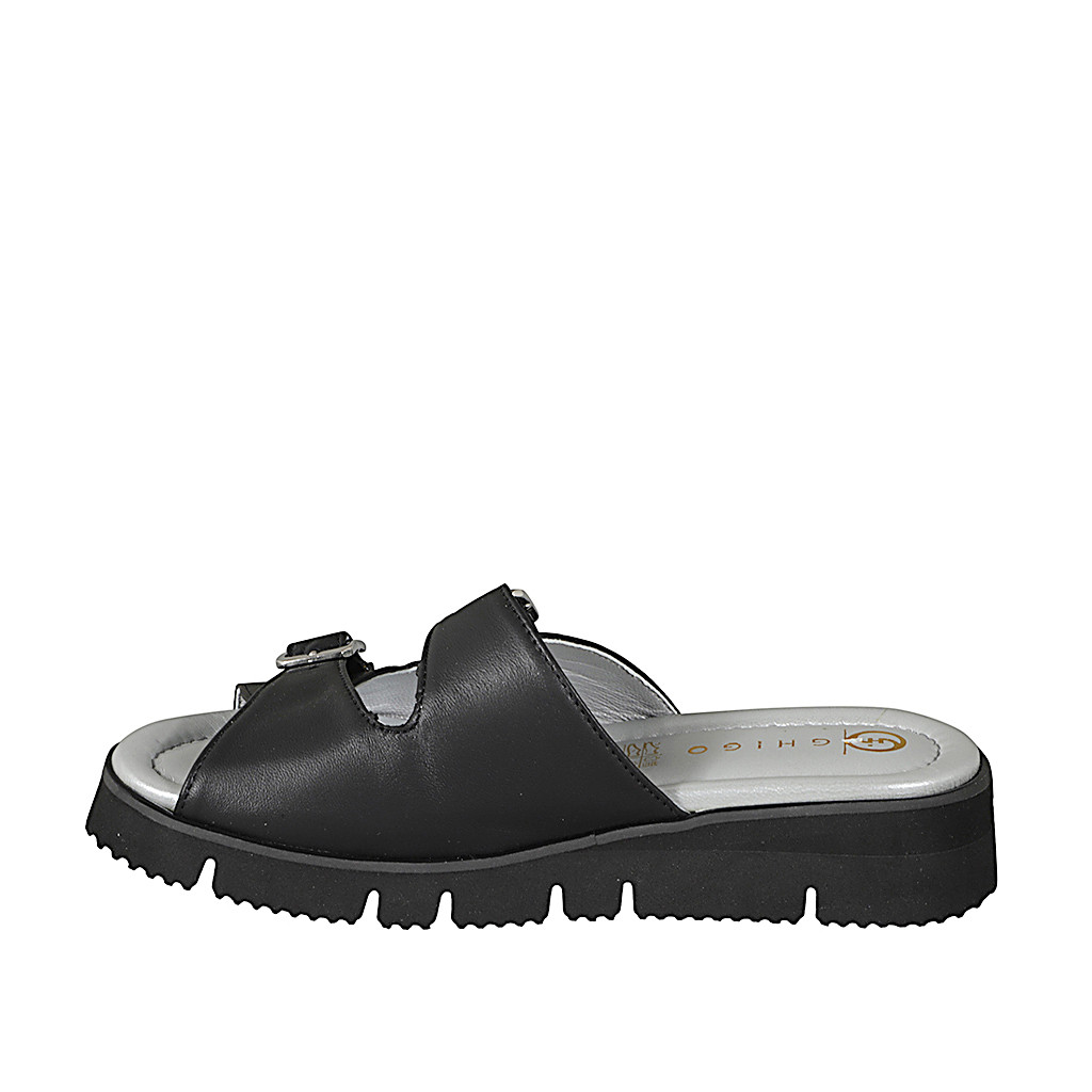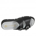 Sandalia estilo Mary Jane para mujer en piel de color negro y laminado plateado con tacón 5