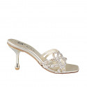 Sabot abierto para mujeres en piel laminada plateada y pedrería de cristal, tacón 8. ¡Diseño refinado y de altísima calidad!