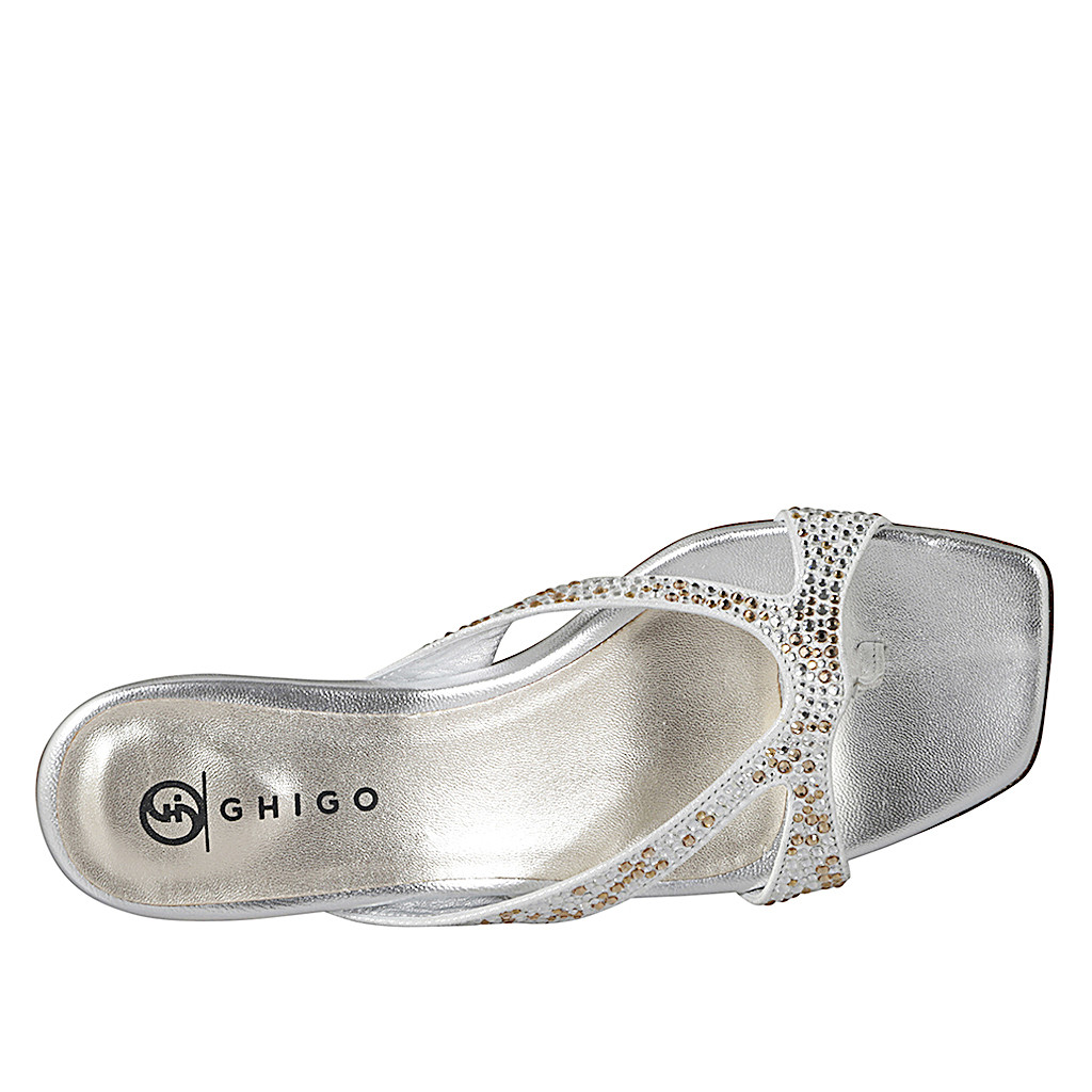 Sabot abierto para mujeres en satèn laminado blanco con pedrería de cristal, tacón 6. ¡Diseño refinado y de altísima calidad!