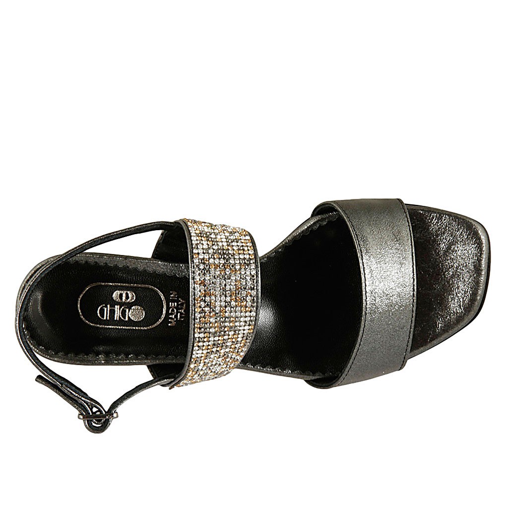 Sandalia en piel laminada gris con estrás multicolores para mujer tacon 2