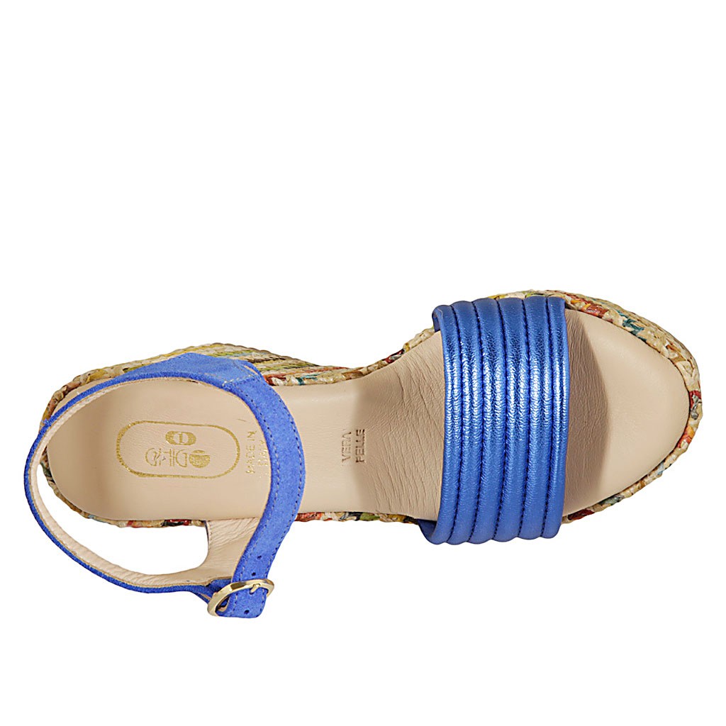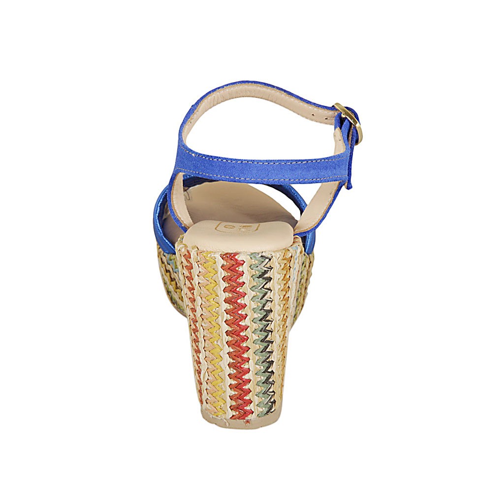 Sandalia para mujer en gamuza y piel laminada azul aciano y tejido multicolor con cinturon, plataforma y cuña 9 - Tallas disponibles:  44
