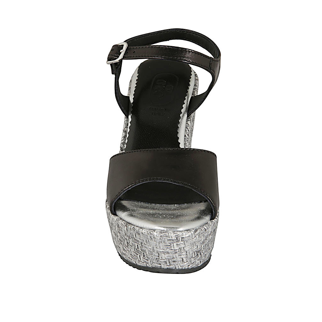 Sandalia para mujer con cinturon y plataforma en piel negra y tejido gris plateado cuña 9 - Tallas disponibles:  42, 43