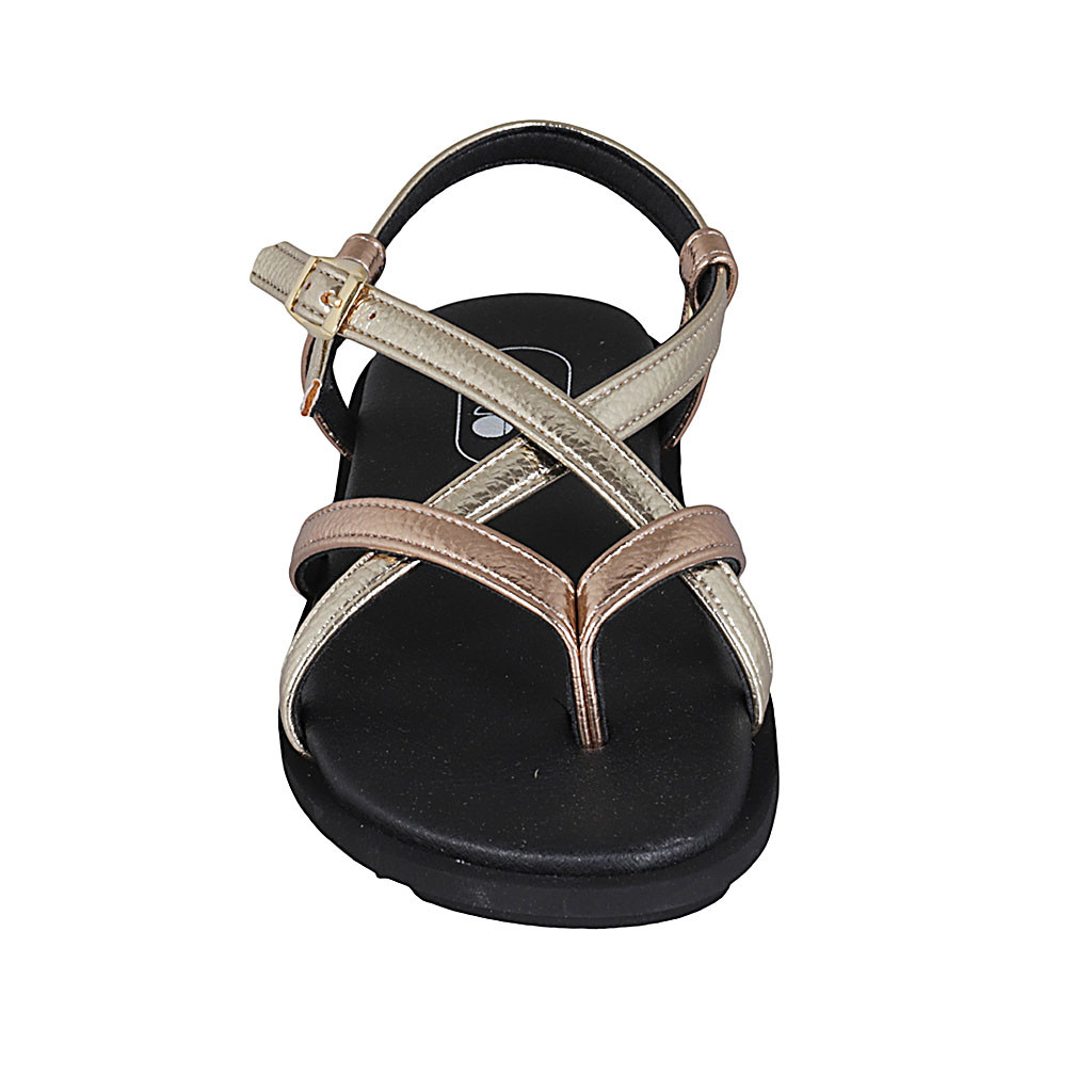 Sandalia de dedo para mujer en piel laminada cobrizo y platino con cinturon cuña 1