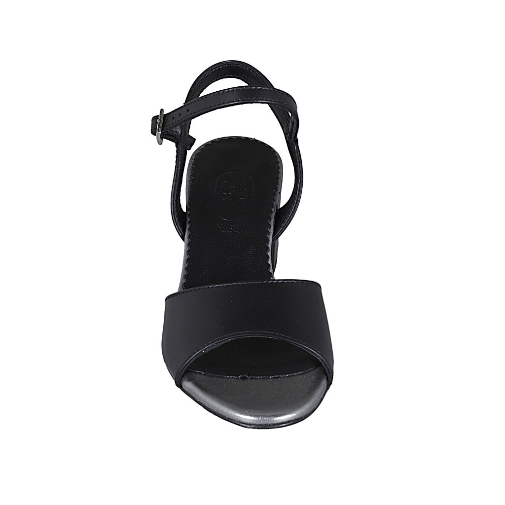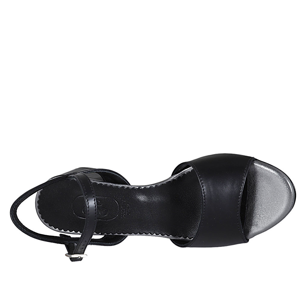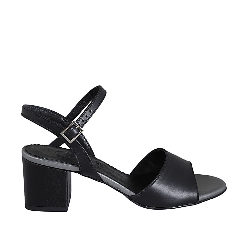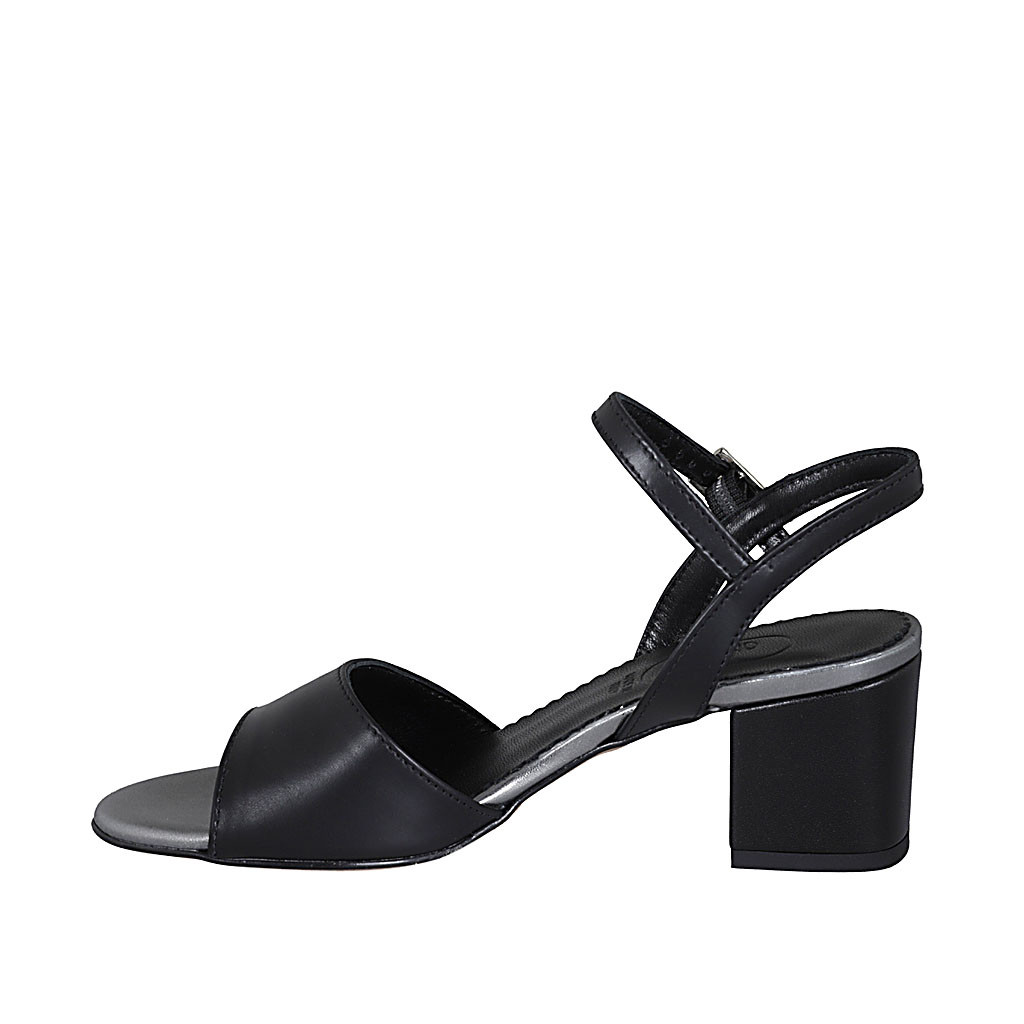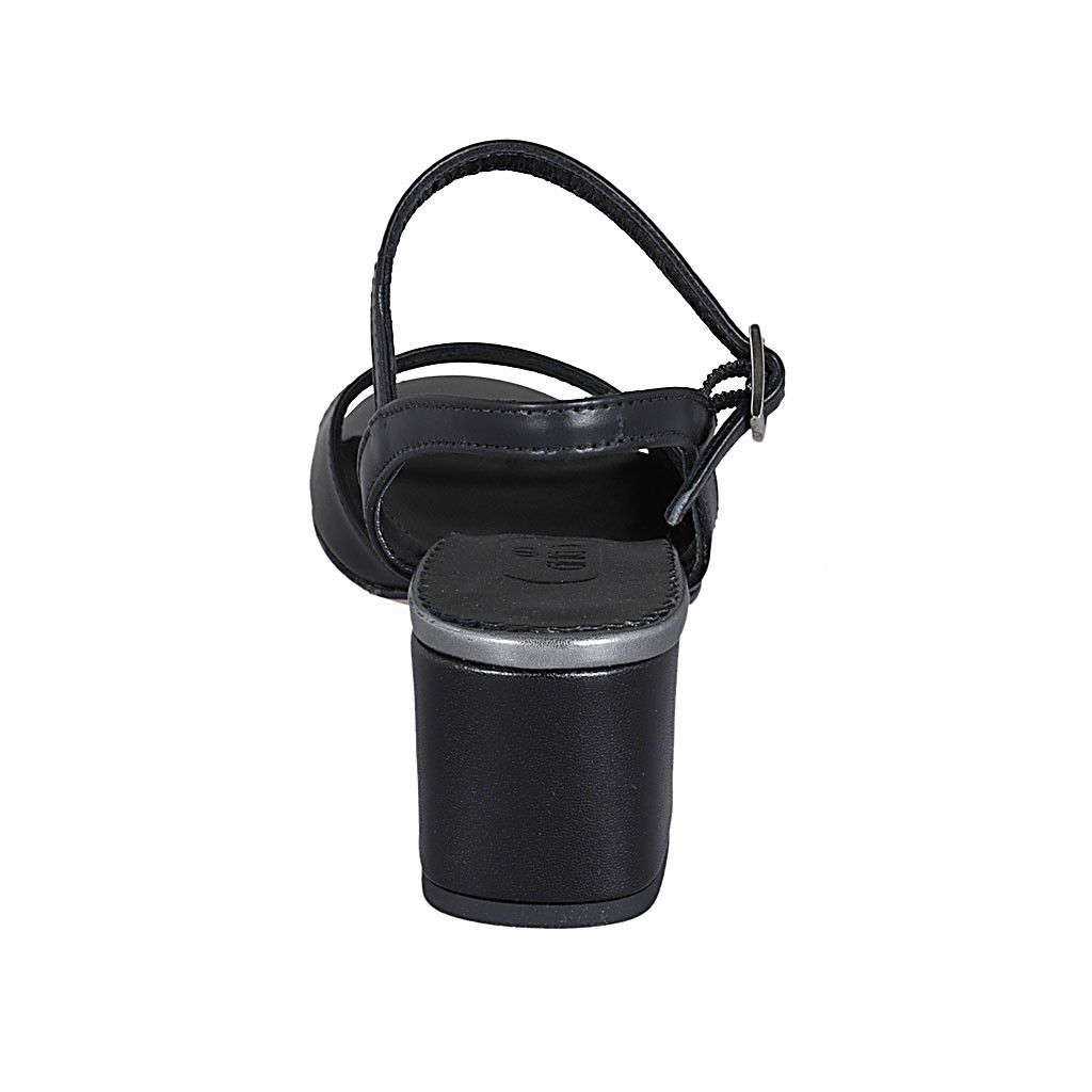 Sandalia para mujer con cinturon en piel negra y piel laminada plateada tacon 5 - Tallas disponibles:  44