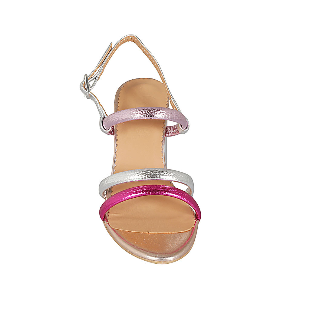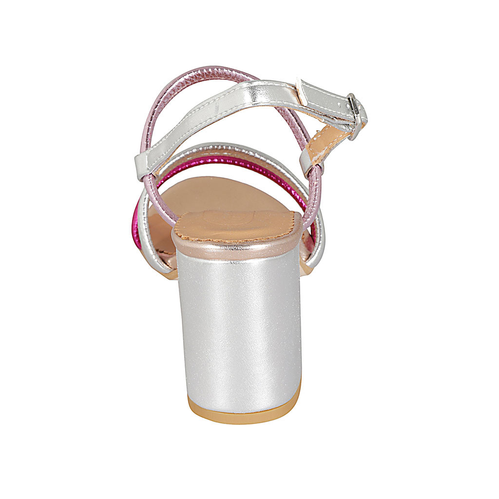 Sandalia para mujer en piel imprimida laminada plateada, fucsia y rosa tacon 7