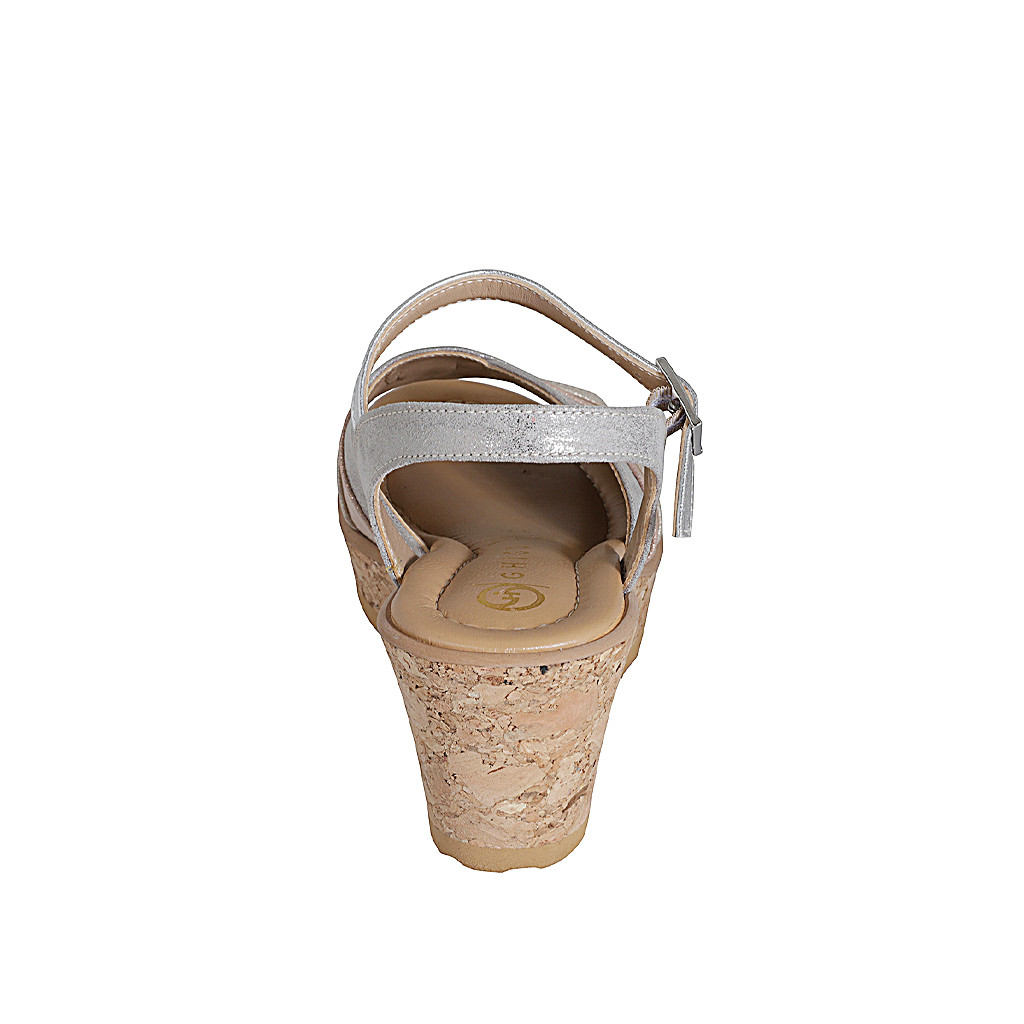 Sandalia para mujer en gamuza laminada gris, beis, rosada y piel laminada plateada con cinturon, plataforma y cuña 7