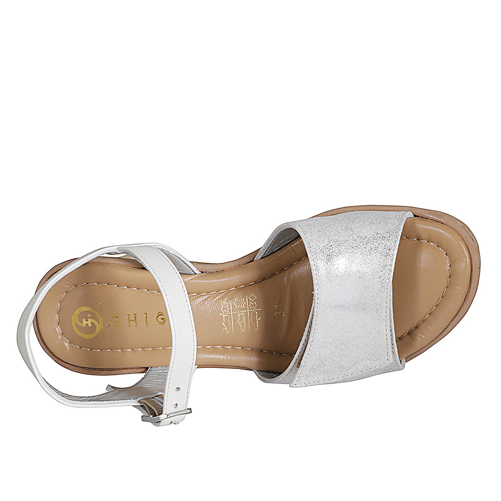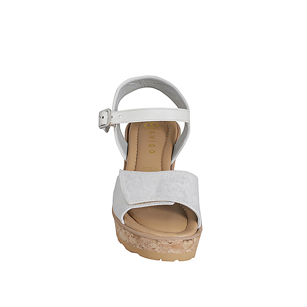 Sandalia para mujer en piel blanca y gamuza laminada plateada con cierre de velcro, cinturon y plataforma cuña 7