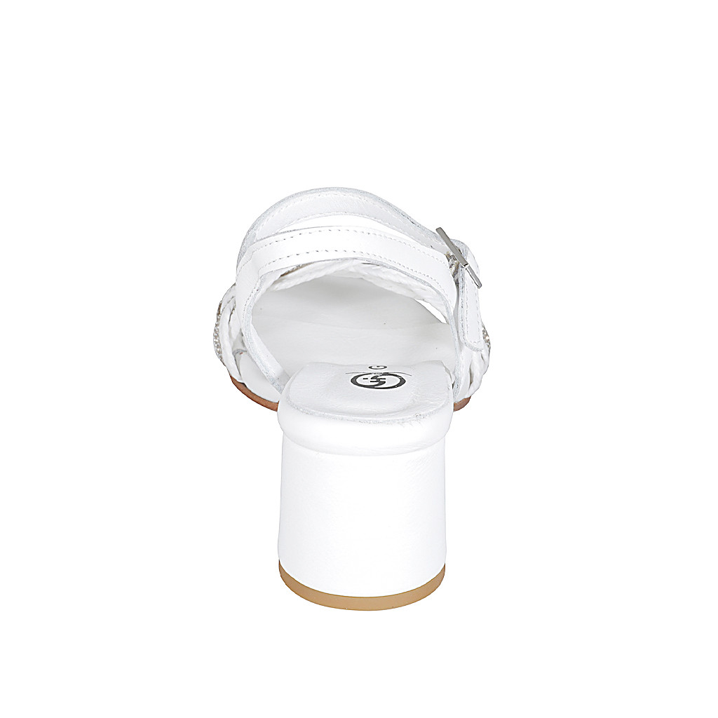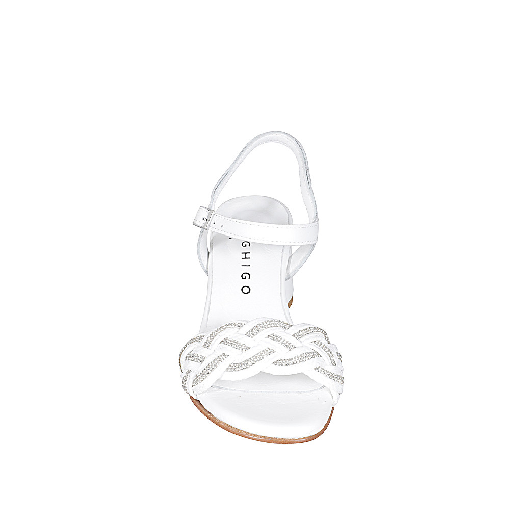 Sandalia con cinturon al tobillo y estrás para mujer en piel y rafia blanca tacon 5