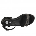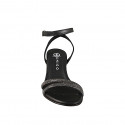 Sandalias para mujer con cinturon al tobillo en piel color negro y tiras con pedrería brillante gris acero con tacón 6