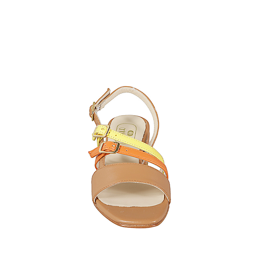 Sandalias para mujer con doble cinturón transversal en piel de color cognac, amarillo y anaranjado con tacón 4