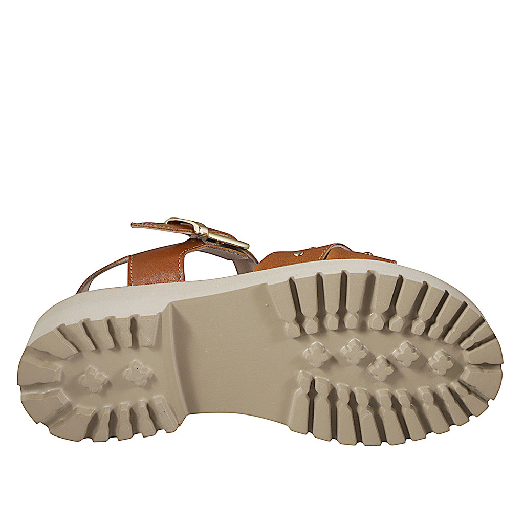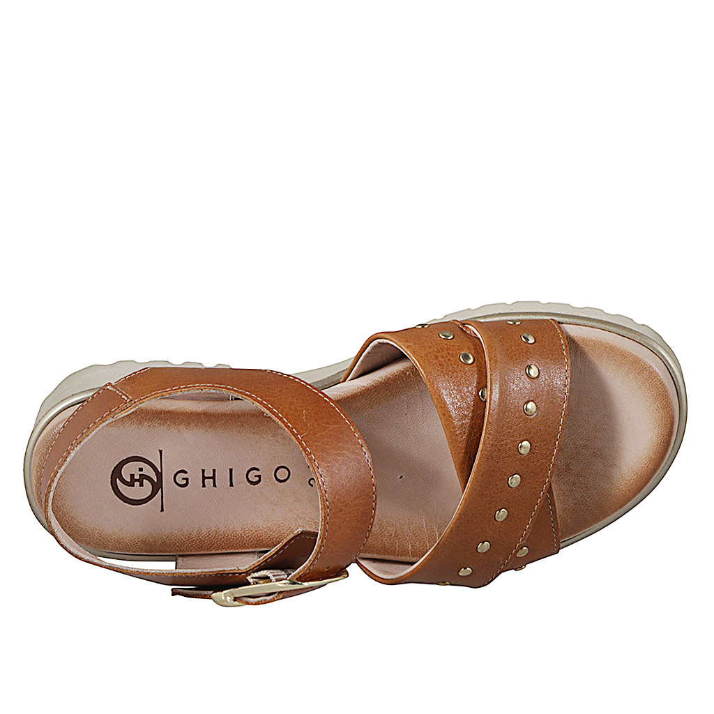Sandalias para mujer con tiras cruzadas en piel de color cognac decoradas con tachuelas doradas, suela dentada y tacón 4