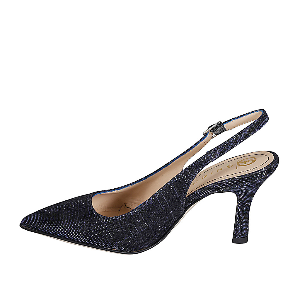 Zapato destalonado a punta para mujer en tejido laminado brillante azul tacon 7 - Tallas disponibles:  32, 43