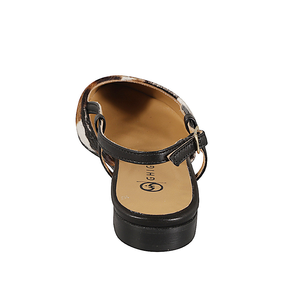 Zapato a punta destalonado en pelo de becerro con pelo moteado negro, blanco y marrón y piel color negro, talón 2