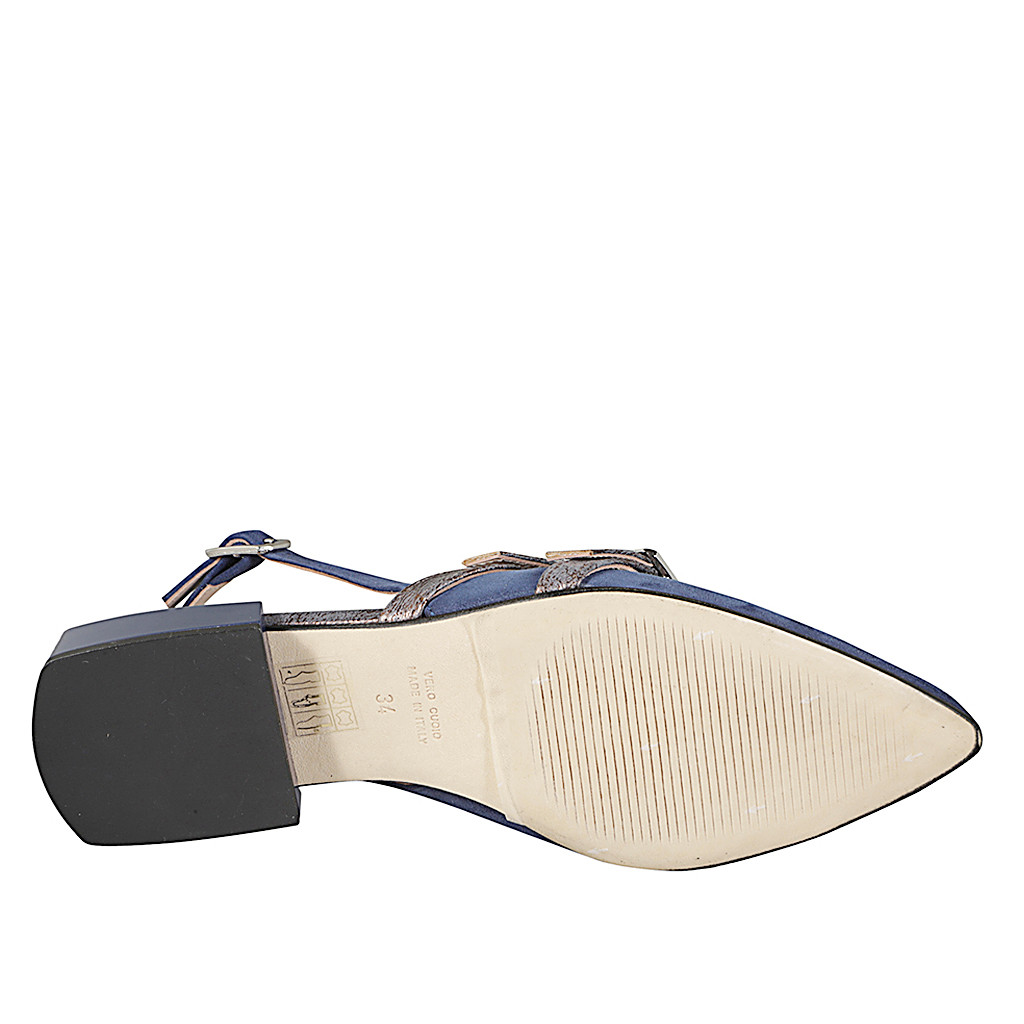 Zapato destalonado a punta para mujer con hebillas en gamuza azul y piel laminada bronce oxidado y con tacón 3