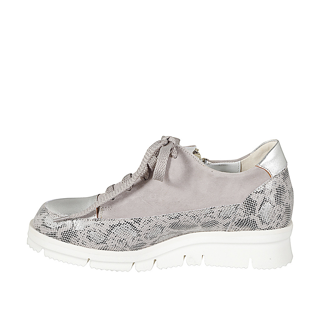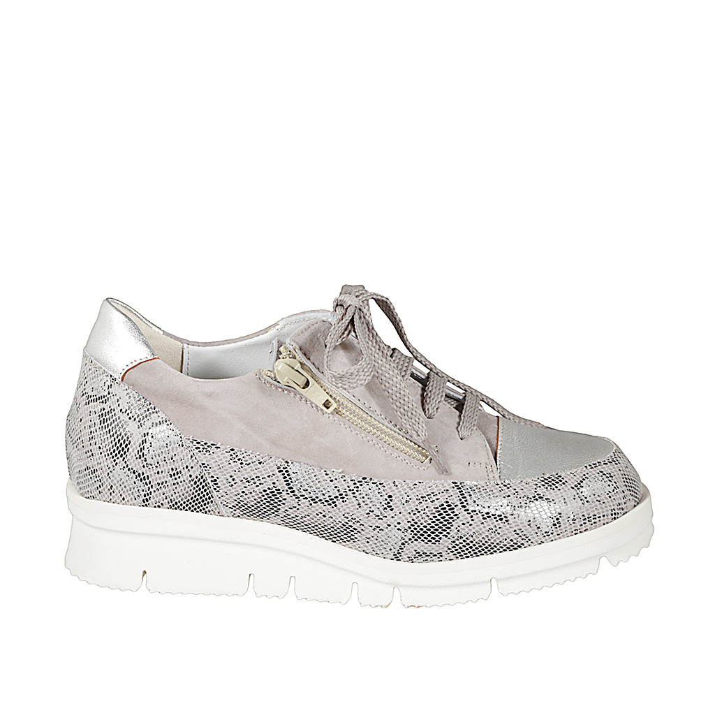 Sneaker con cordones con cremallera y plantilla extraíble en gamuza gris, piel imprimida y piel plateada con cuña 3