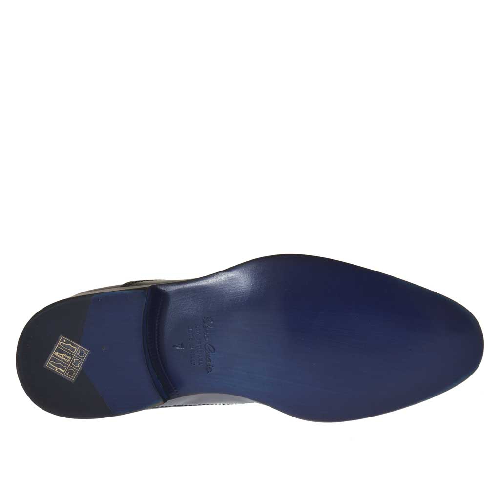 Elegante zapato para hombre con cordones opcionales, en piel y charol de color azul oscuro, fondo en cuero, forro en piel. Disponible en tallas pequeñas y en tallas grandes.
