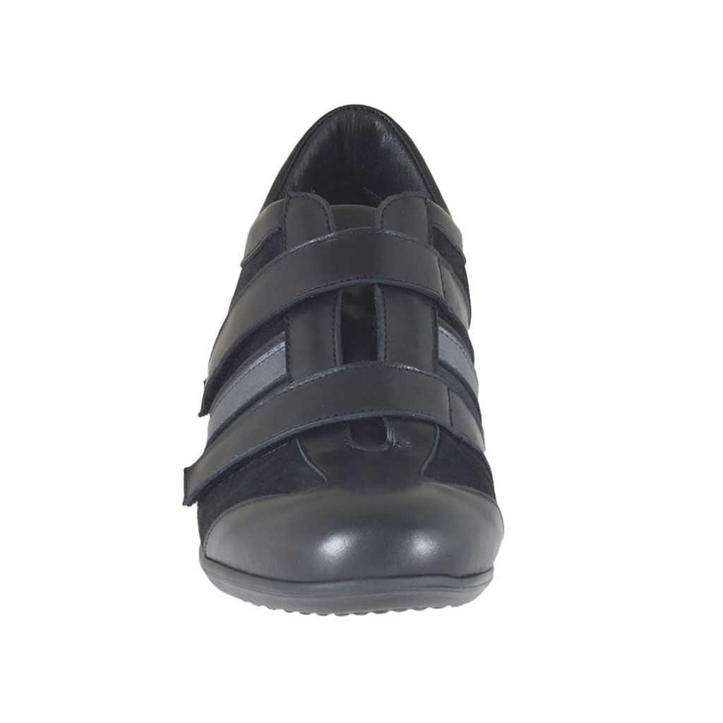 Zapato deportivo para mujer con cierres de velcro, altura cuña 5 cm con plantilla extraíble, en piel y gamuza negra y bronce de cañon, fondo en goma, forro en piel. Disponible en tallas grandes.