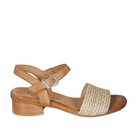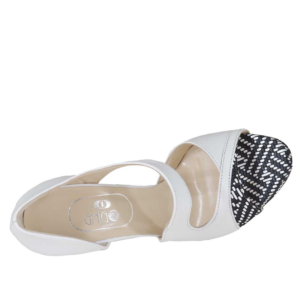Zapato abierto para mujer, altura tacon 9 cm, en piel blanca y gamuza estampada óptical, fondo en cuero, forro en piel. Disponible en las tallas pequeñas y grandes.