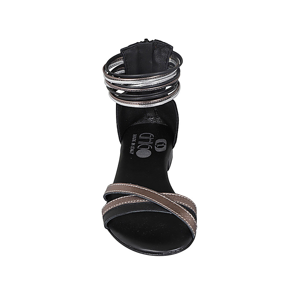 Zapato abierto con cremallera para mujer en piel negra y piel laminada plateada y cobrizo tacon 2
