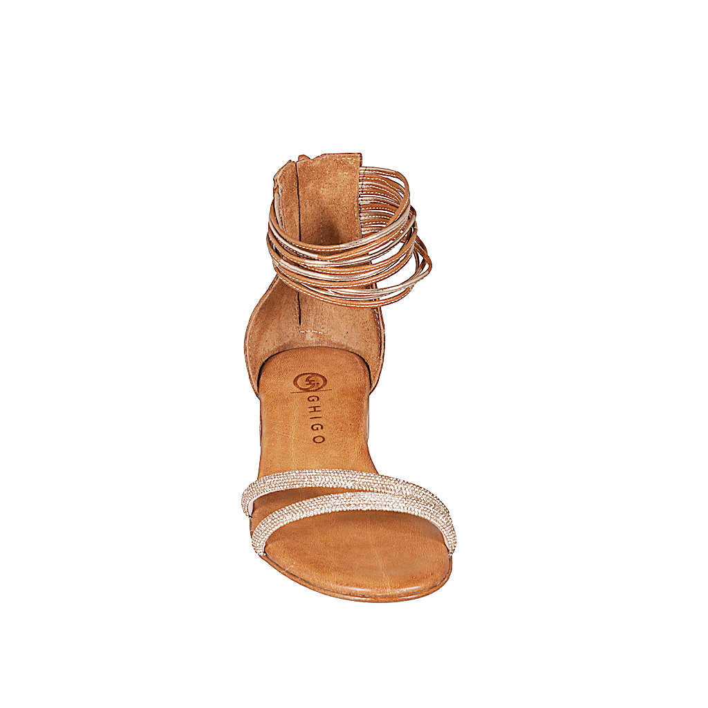 Zapato abierto con cremallera y estras para mujer en piel cognac y piel laminada cobrizo tacon 2
