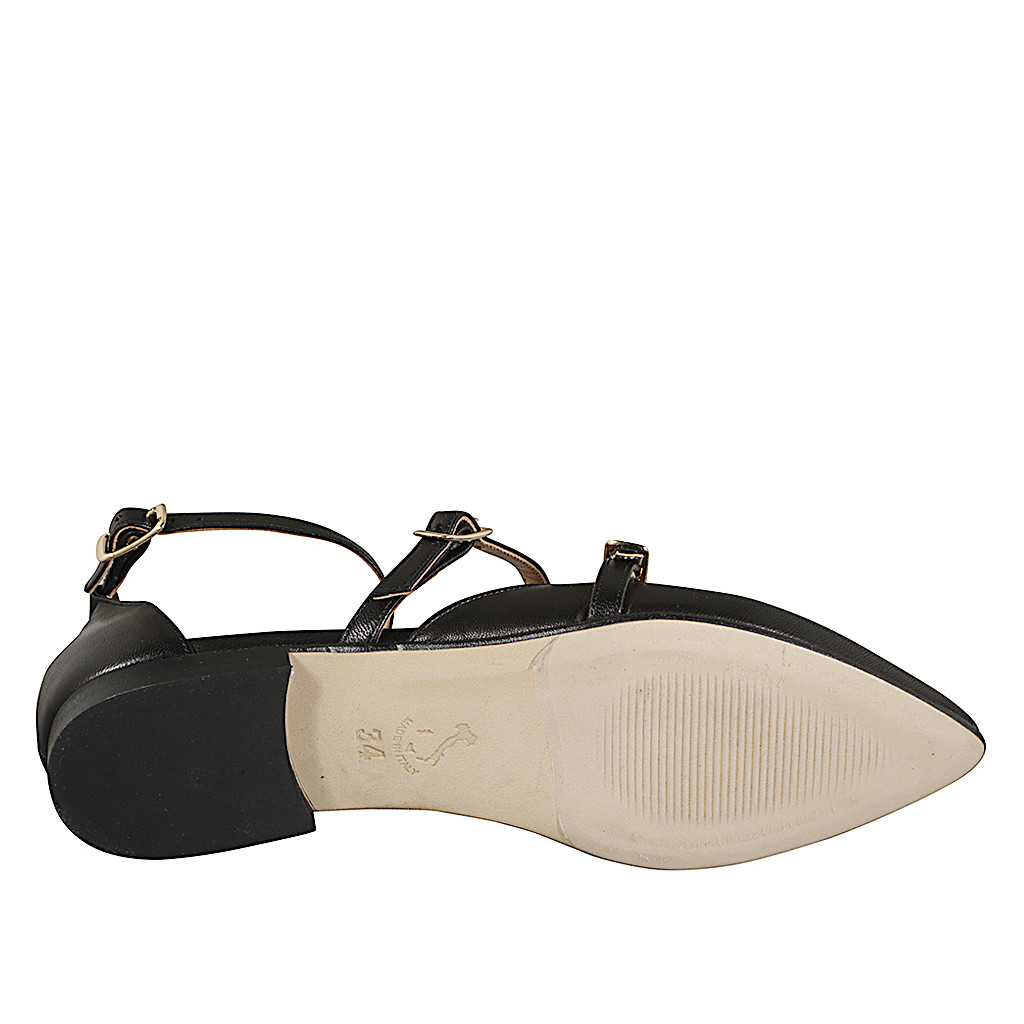 Zapato abierto puntiagudo para mujer con 3 correas en piel laminada color negro, tacón 2