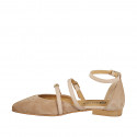 Zapato abierto puntiagudo para mujer con 3 correas en gamuza gris pardo y piel color nude, tacón 2