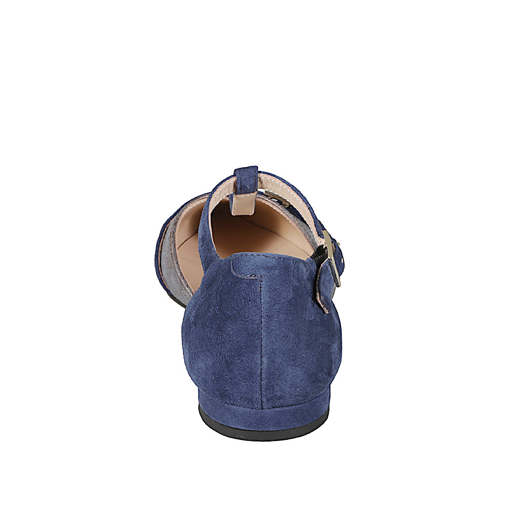 Zapatos abiertos puntiagudos para mujer con cinturón Charleston en gamuza azul y piel laminada bronce oxidado, con tacón 2