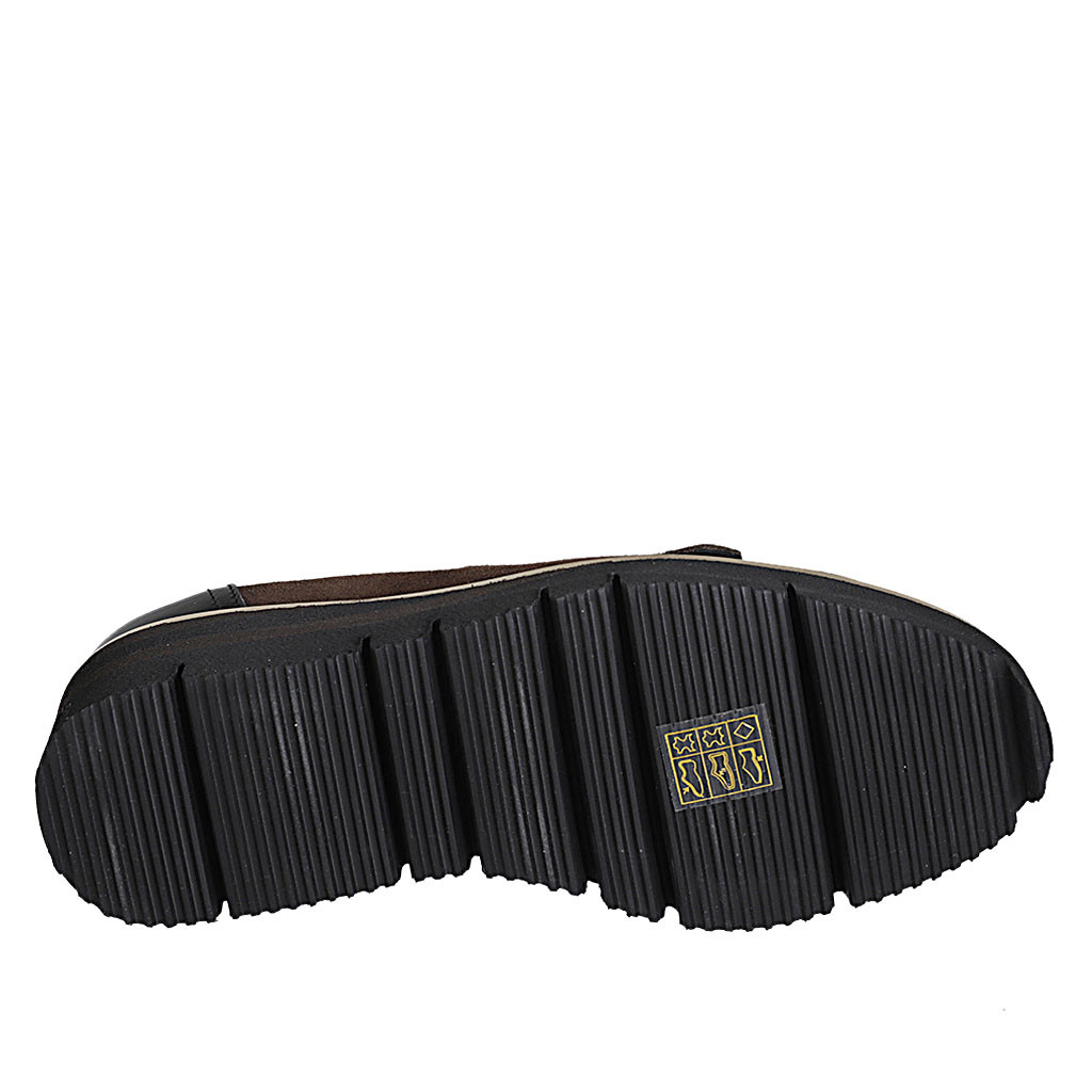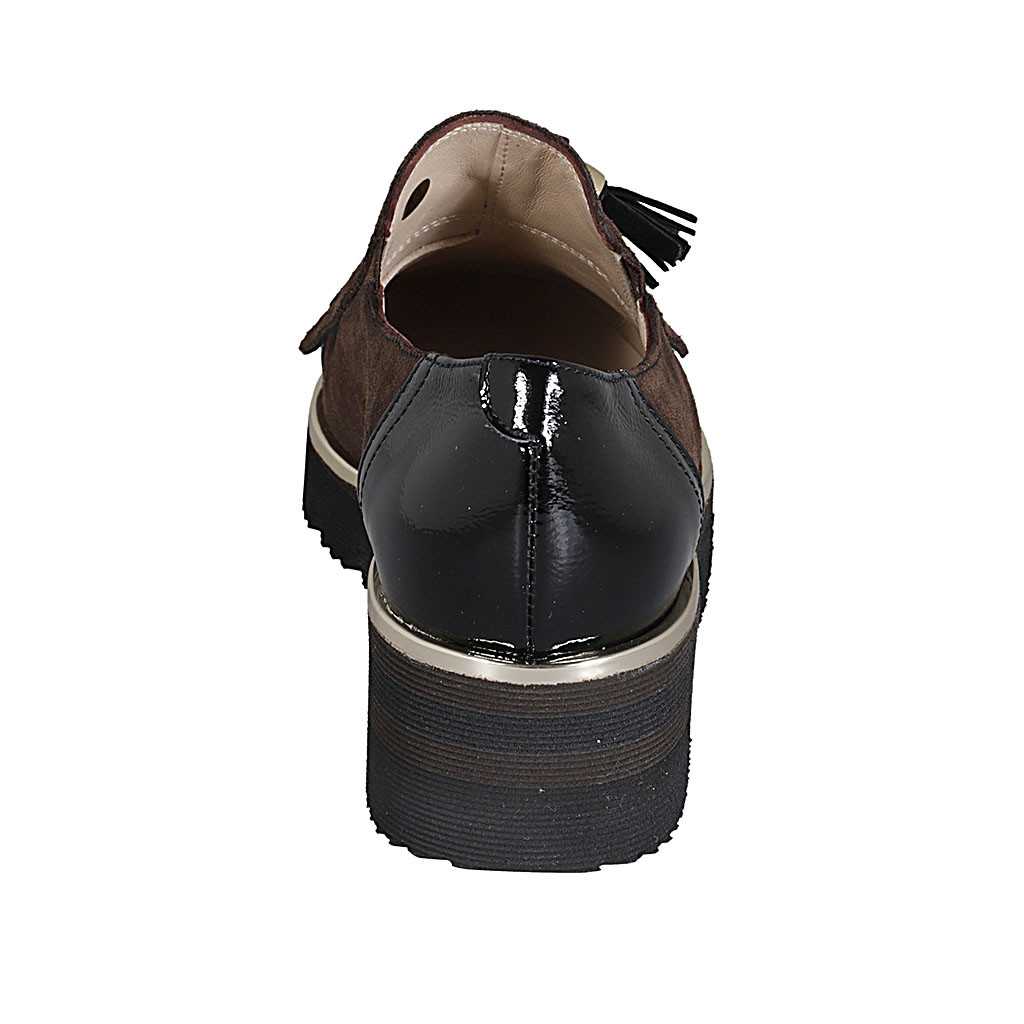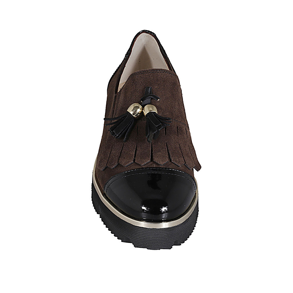 Mocasino para mujer con elasticos, flecos y borlas en gamuza marron y charol negro cuña 4 - Tallas disponibles:  45, 46