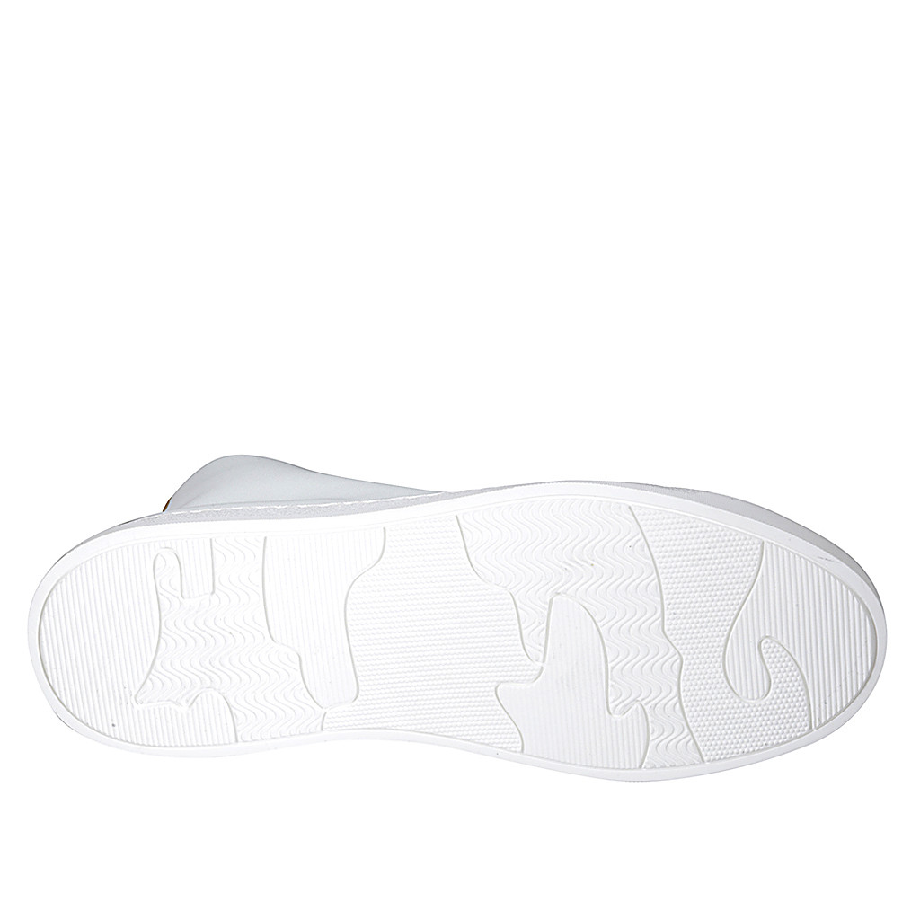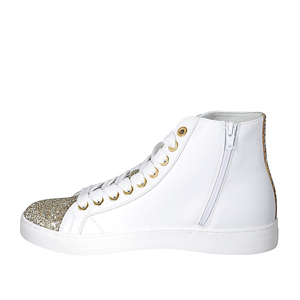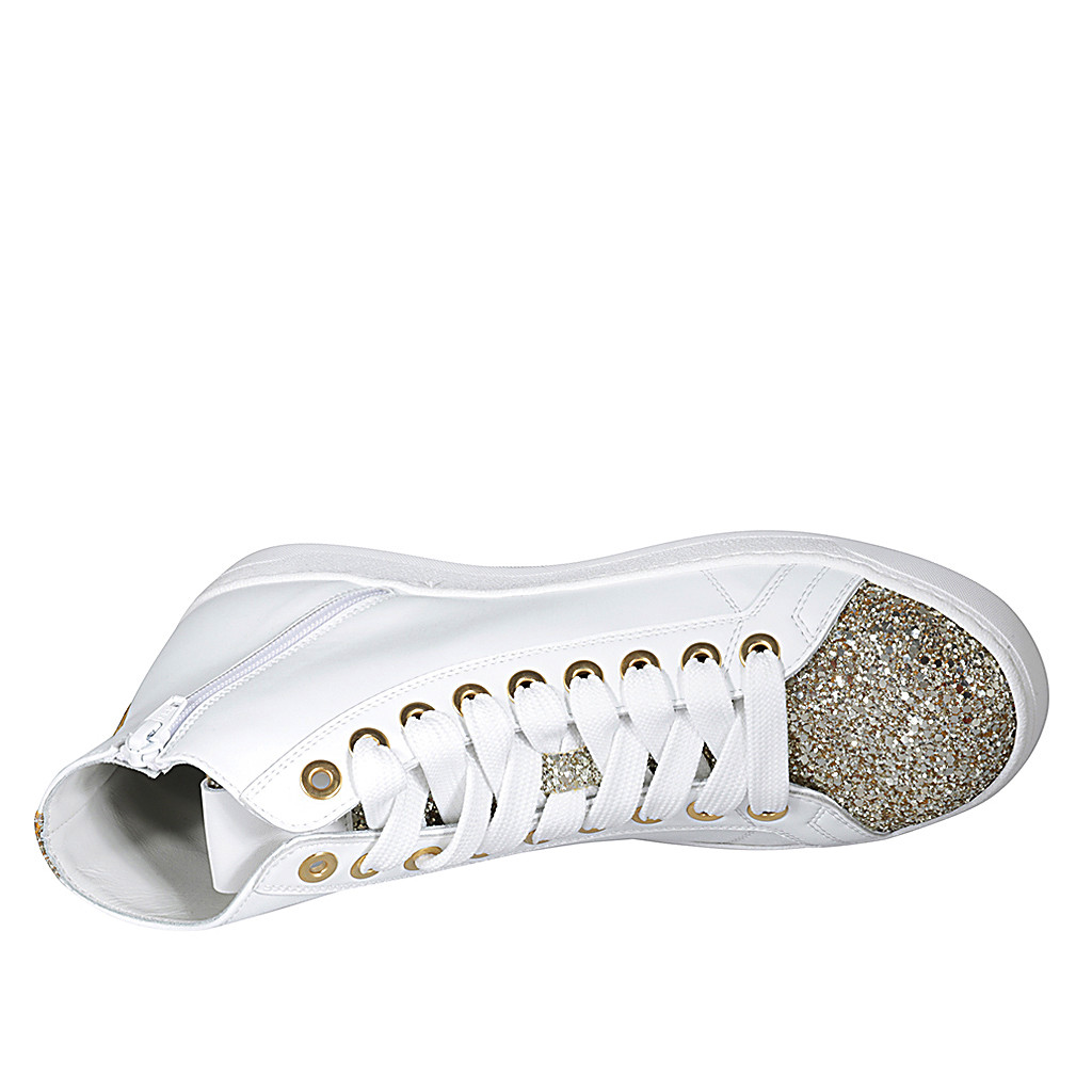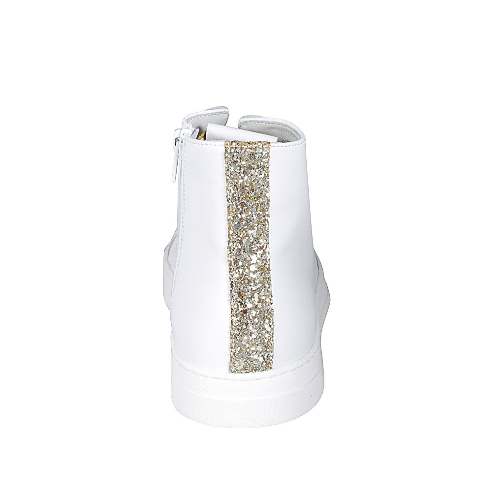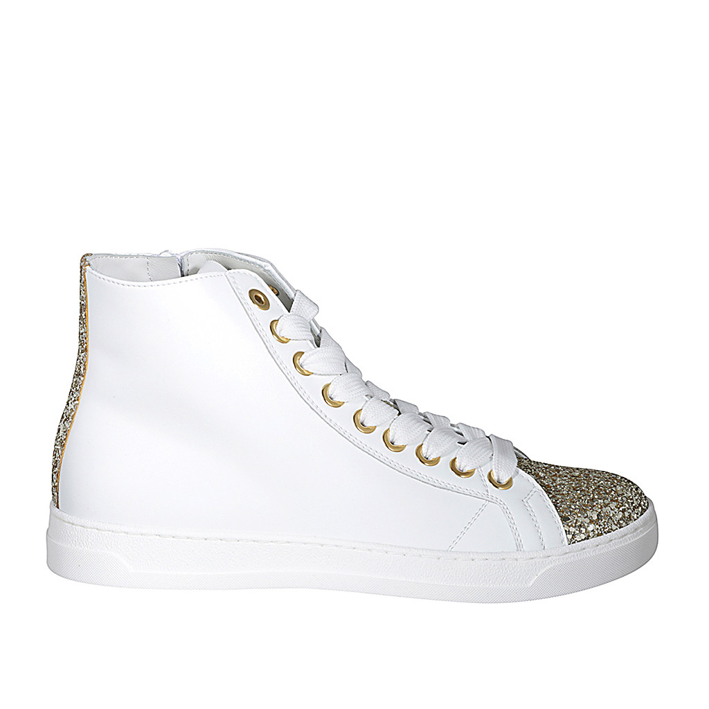 Zapato para mujer con cordones, cremallera, y plantilla extraible en piel blanca y platino brillante cuña 3