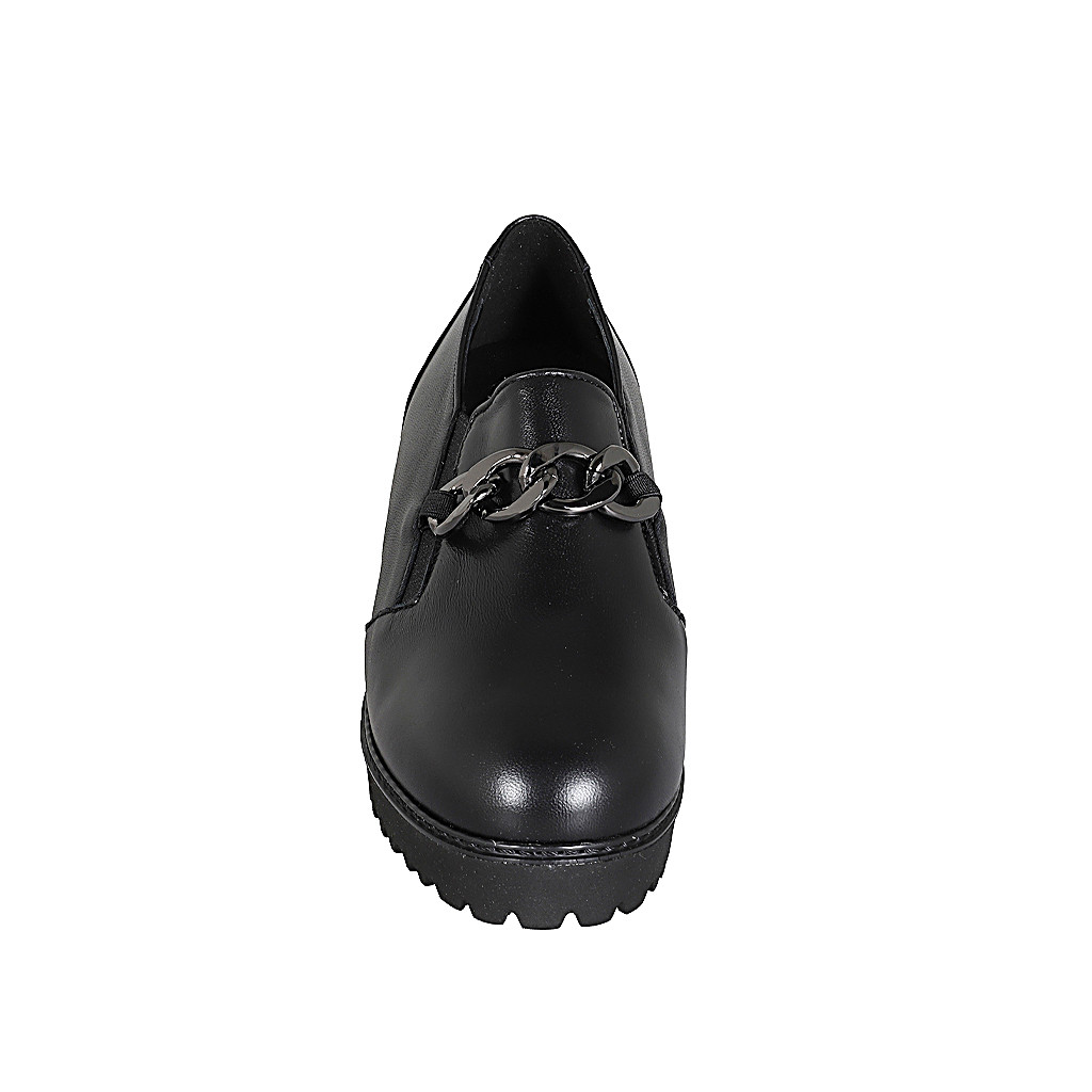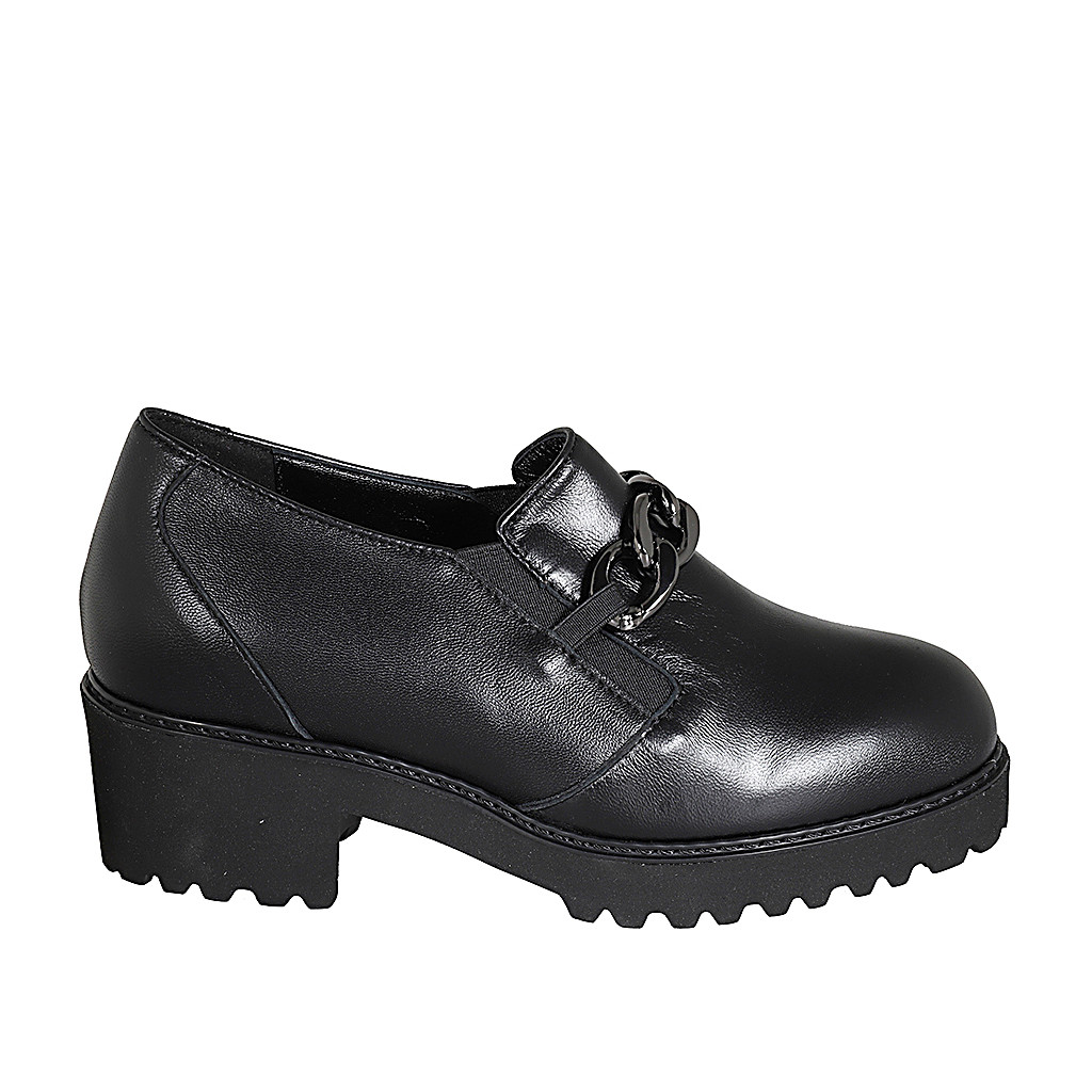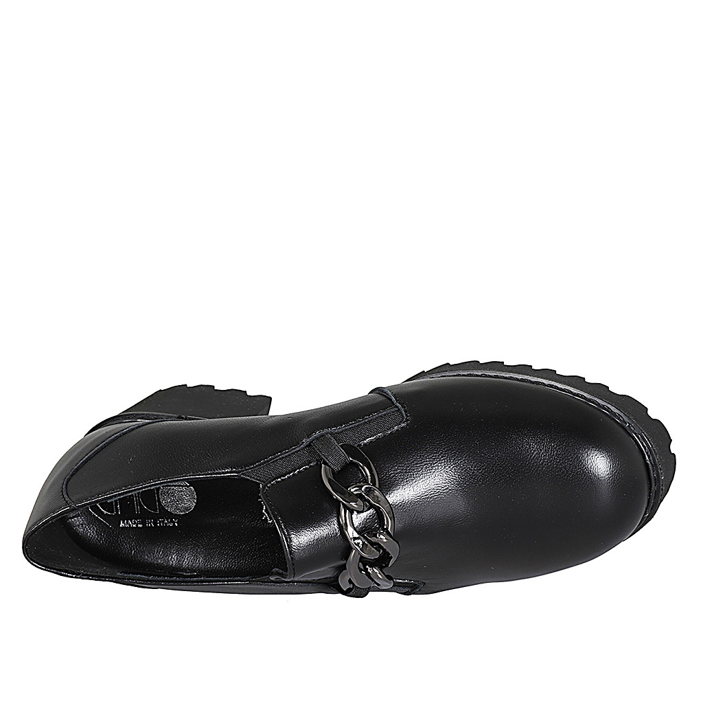 Zapato cerrado para mujer con elasticos, cadena y plantilla extraible en piel negra tacon 5 - Tallas disponibles:  42, 44