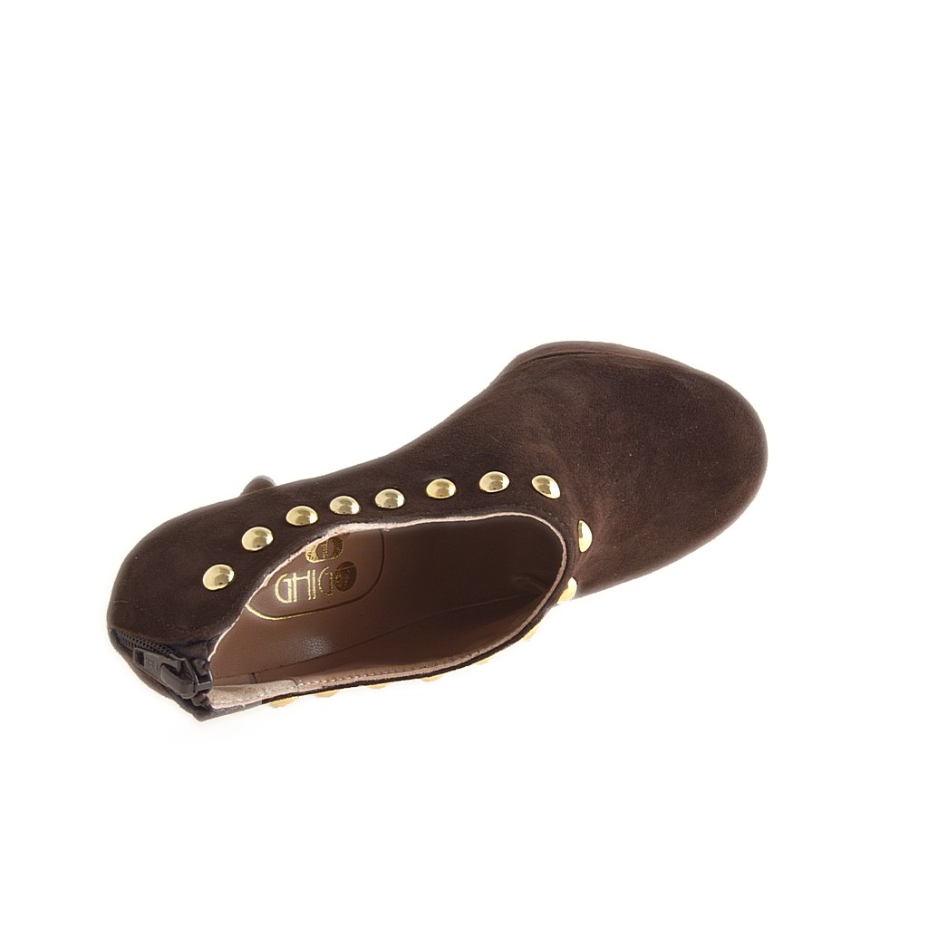 Zapato cerrado con plataforma, tachuelas y cremallera en gamuza color marrón tacon 15
