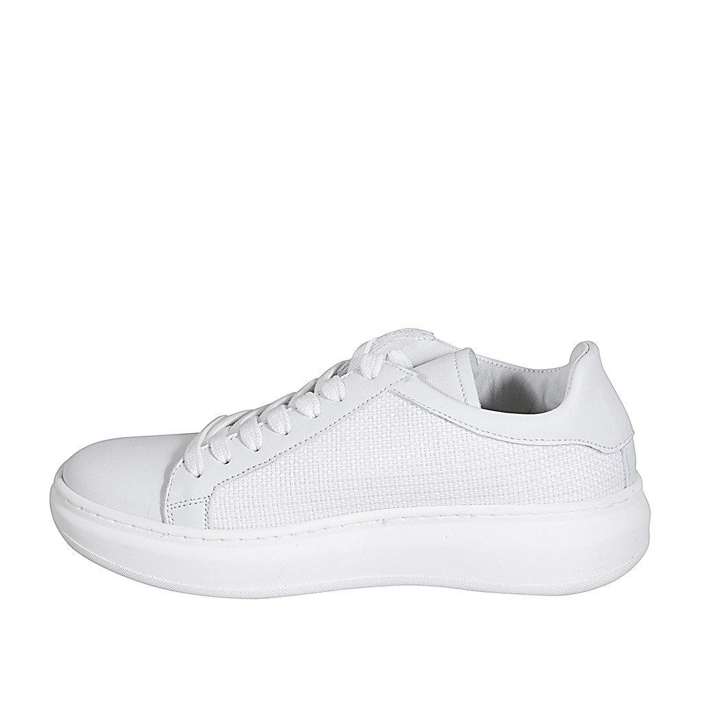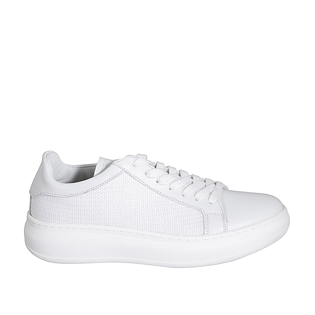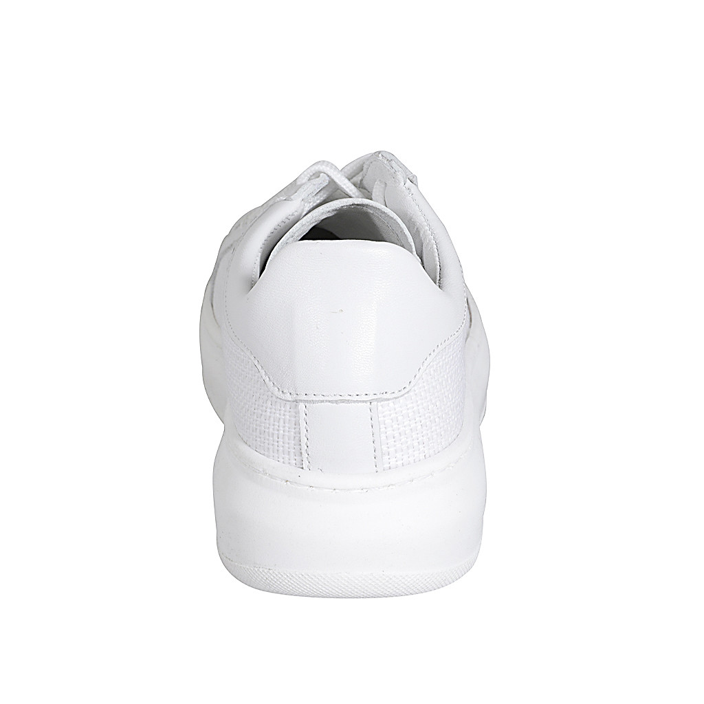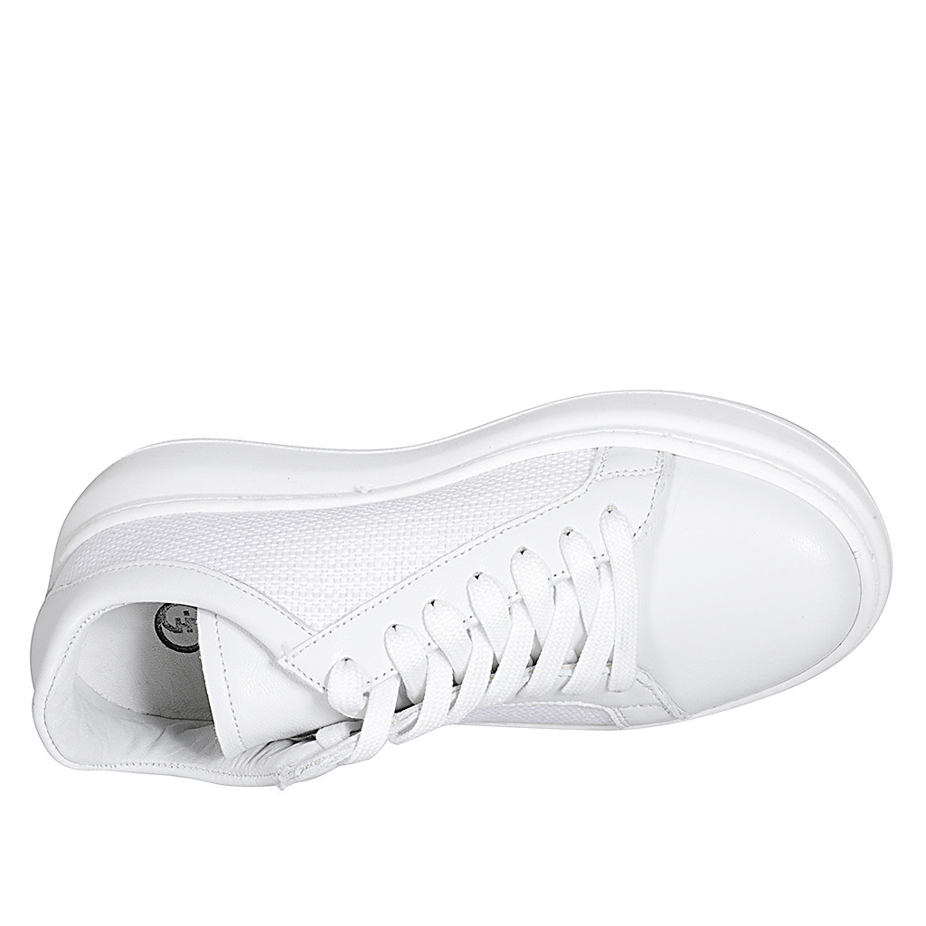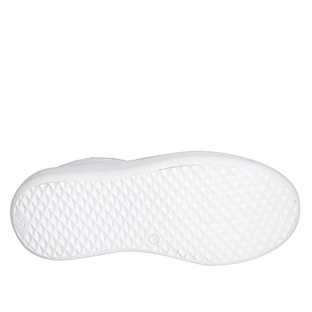 Zapato para mujer con cordones en piel blanca, laminada platino y plateado cuña 2