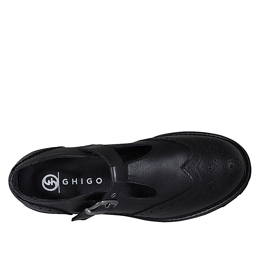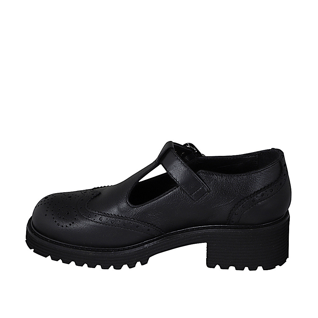 Zapato Mary Jane con cinturon charleston y punta de ala para mujer en piel negra tacon 5