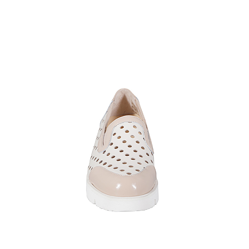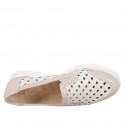 Zapato cerrado para mujer con plantilla extraible en gamuza perforada colo marfil y cahrol de color nude y cuña 3