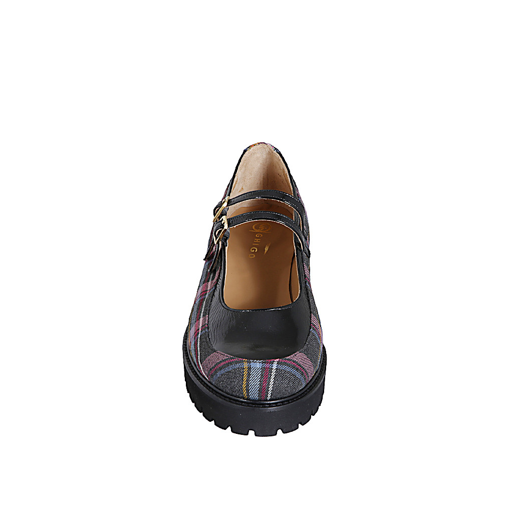 Zapato Mary Jane para mujer con cinturones en tejido de tartan multicolor y charol negro tacon 4