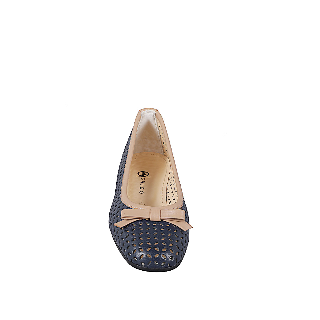 Zapato de salón con moño para mujer hecho en piel perforada color azul oscuro y detalles en piel nude con tacón 3