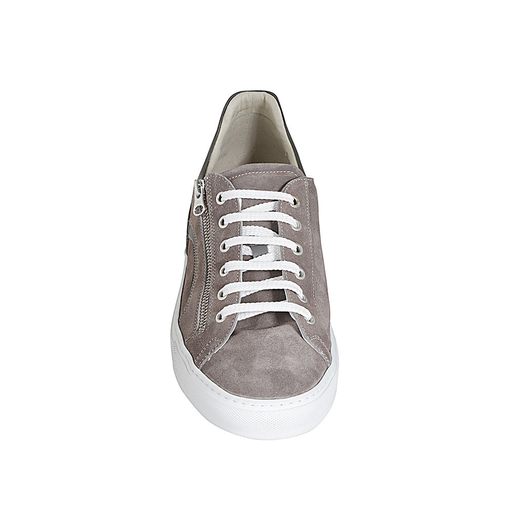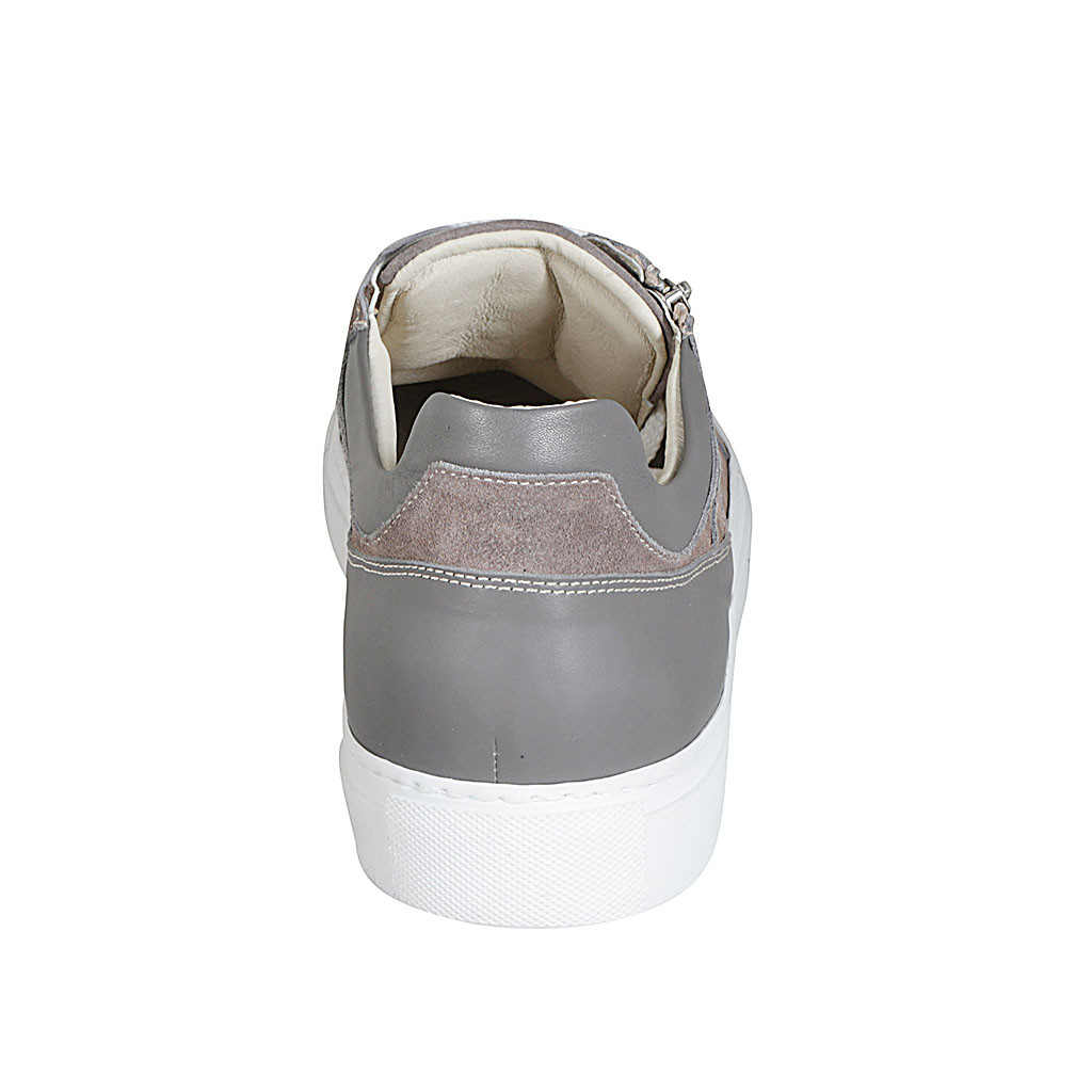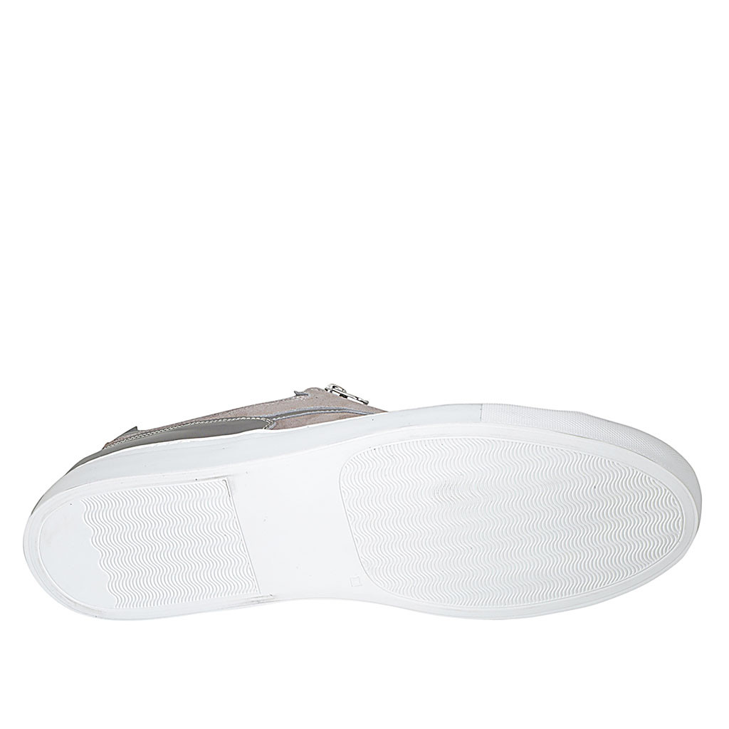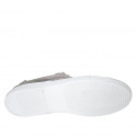 Zapato con cordones, estras y plantilla extraible en piel blanca, laminada plateada y gamuza azul...