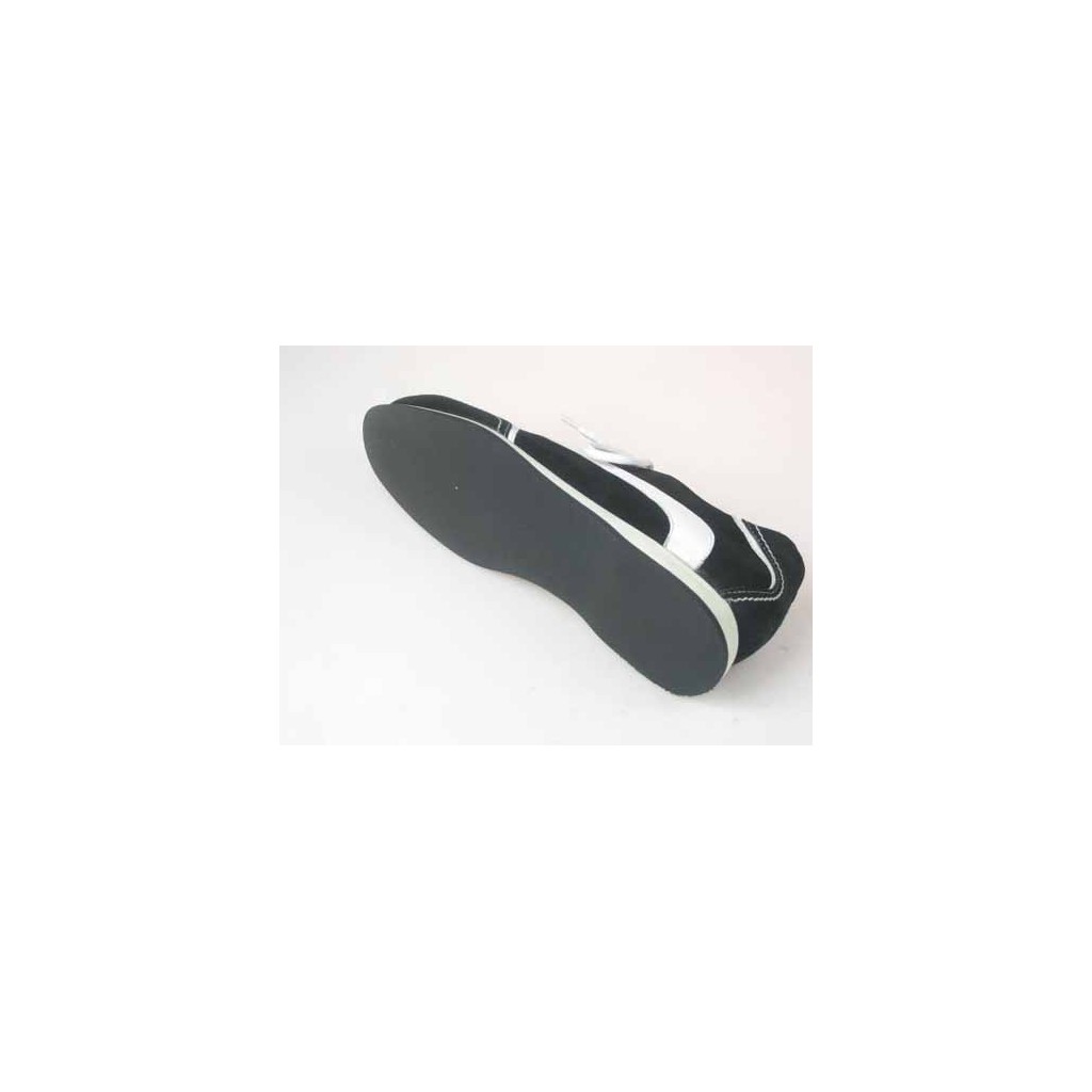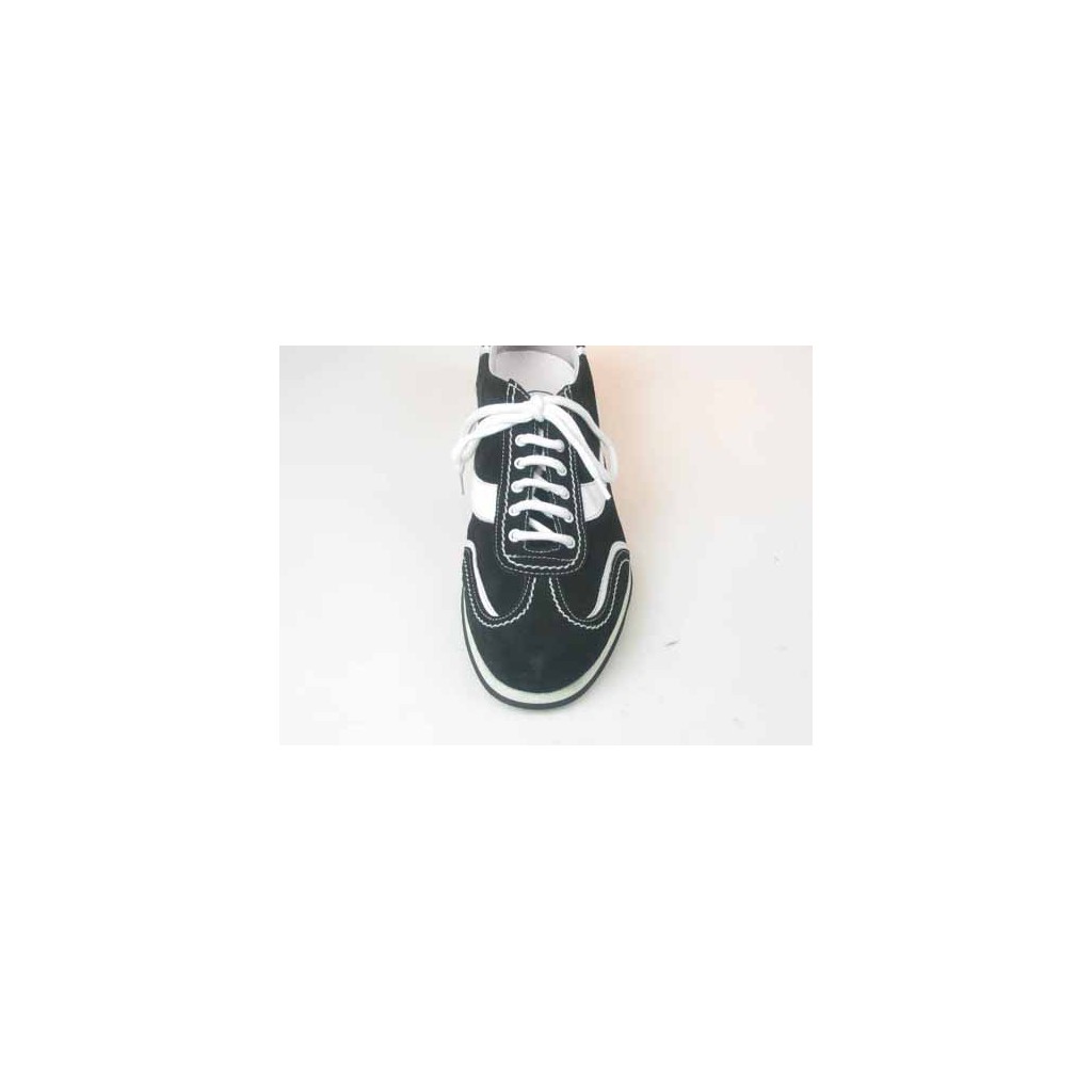 Zapato deportivo con cordones, en gamuza de color negro y piel blanca, fondo en goma, forro en piel.
