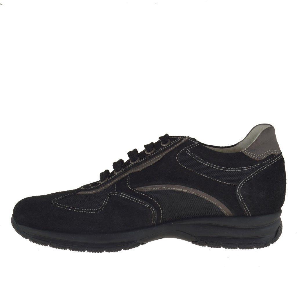 Zapato deportivo con cordones para hombre, en gamuza y tejido de color negro y piel gris pardo, fondo en goma, forro en piel.