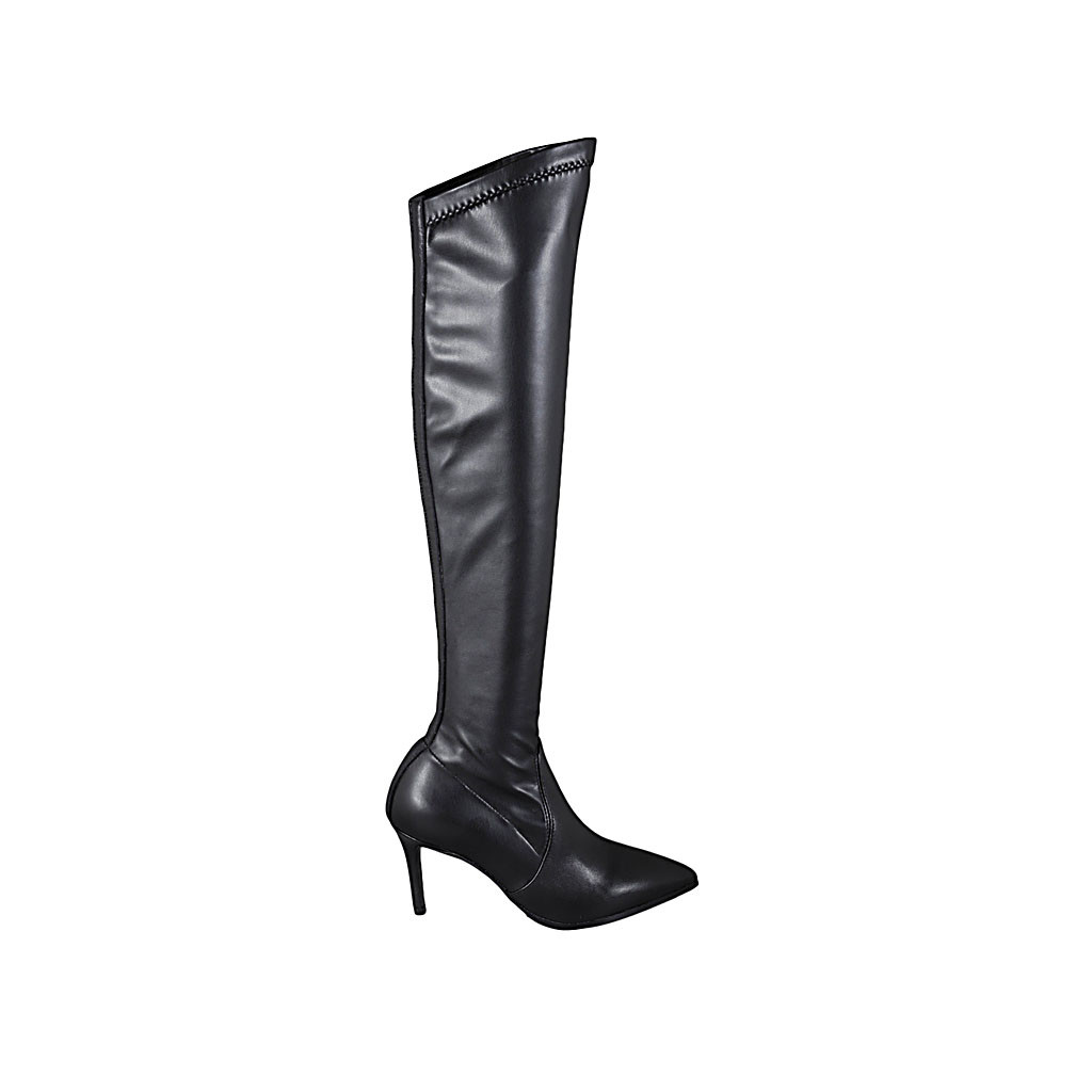 Bottes à bout pointu et au dessous de genou pour femmes en cuir et materiau élastique noir talon 7